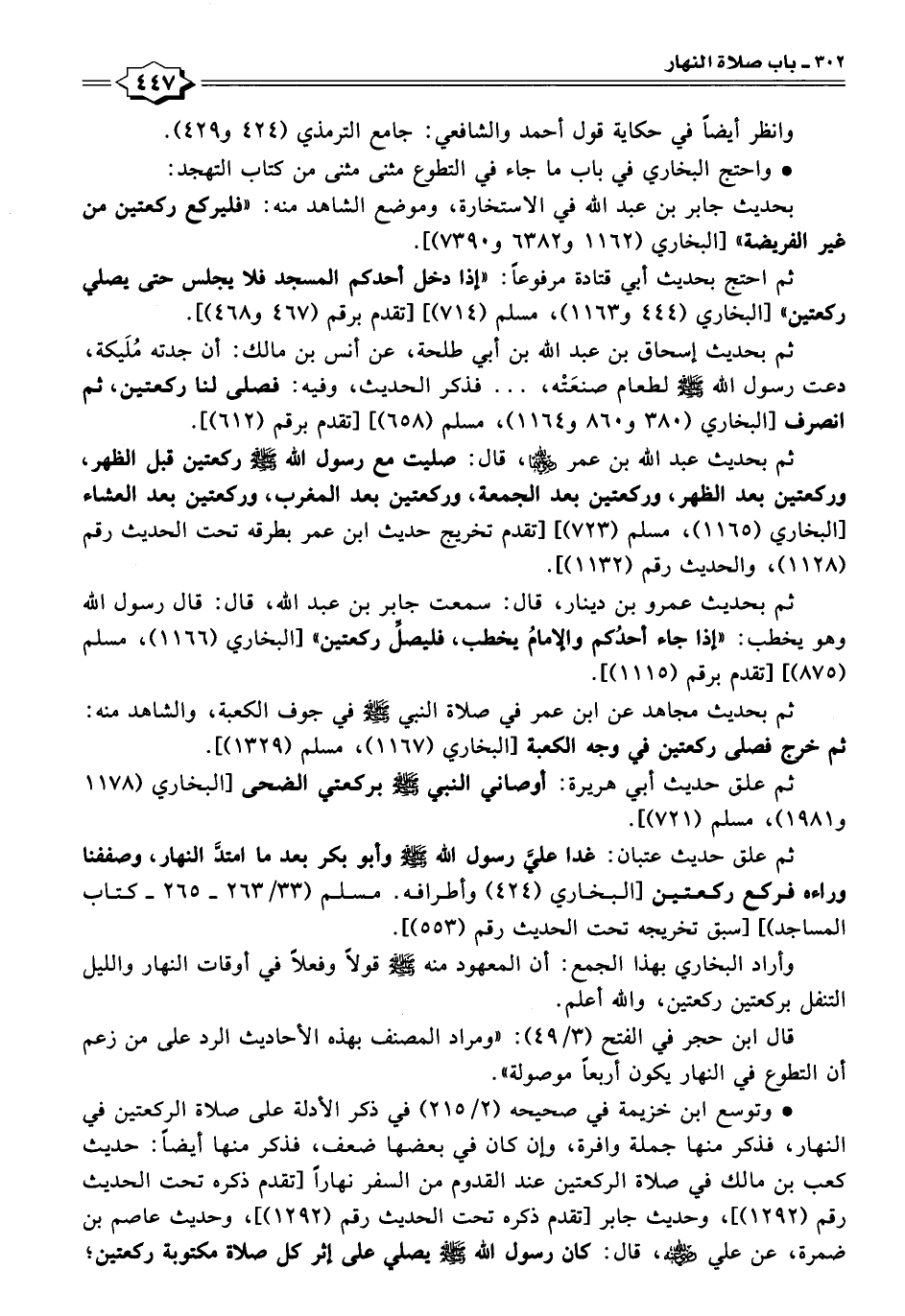• وتوسع ابن خزيمة في صحيحه (٢/ ٢١٥) في ذكر الأدلة على صلاة الركعتين في النهار، فذكر منها جملة وافرة، وإن كان في بعضها ضعف، فذكر منها أيضًا: حديث كعب بن مالك في صلاة الركعتين عند القدوم من السفر نهارًا [تقدم ذكره تحت الحديث رقم (١٢٩٢)]، وحديث جابر [تقدم ذكره تحت الحديث رقم (١٢٩٢)]، وحديث عاصم بن ضمرة، عن علي - رضي الله عنه -، قال: كان رسول الله - صلى الله عليه وسلم - يصلي على إثر كل صلاة مكتوبة ركعتين؛