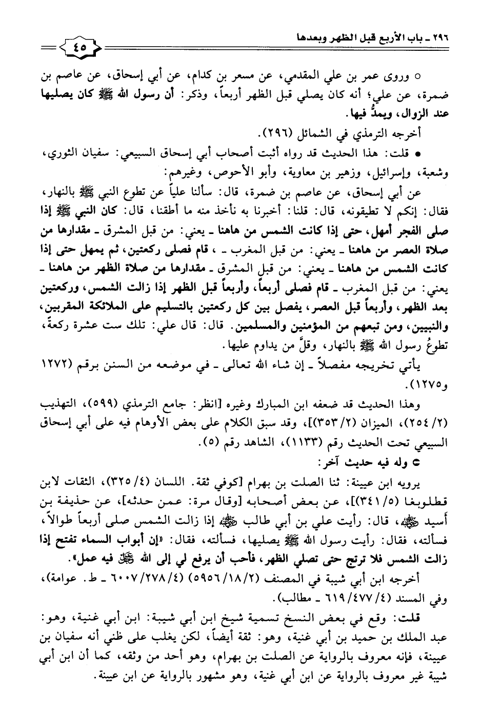 يرويه ابن عيينة: ثنا الصلت بن بهرام [كوفي ثقة. اللسان (٤/ ٣٢٥)، الثقات لابن قطلوبغا (٥/ ٣٤١)]، عن بعض أصحابه [وقال مرة: عمن حدثه]، عن حذيفة بن أَسيد - رضي الله عنه -، قال: رأيت علي بن أبي طالب - رضي الله عنه - إذا زالت الشمس صلى أربعًا طوالًا، فسألته، فقال: رأيت رسول الله - صلى الله عليه وسلم - يصليها، فسألته، فقال: "إن أبواب السماء تفتح إذا زالت الشمس فلا ترتج حتى تصلي الظهر، فأحب أن يرفع لي إلى الله عز وجل فيه عمل".
