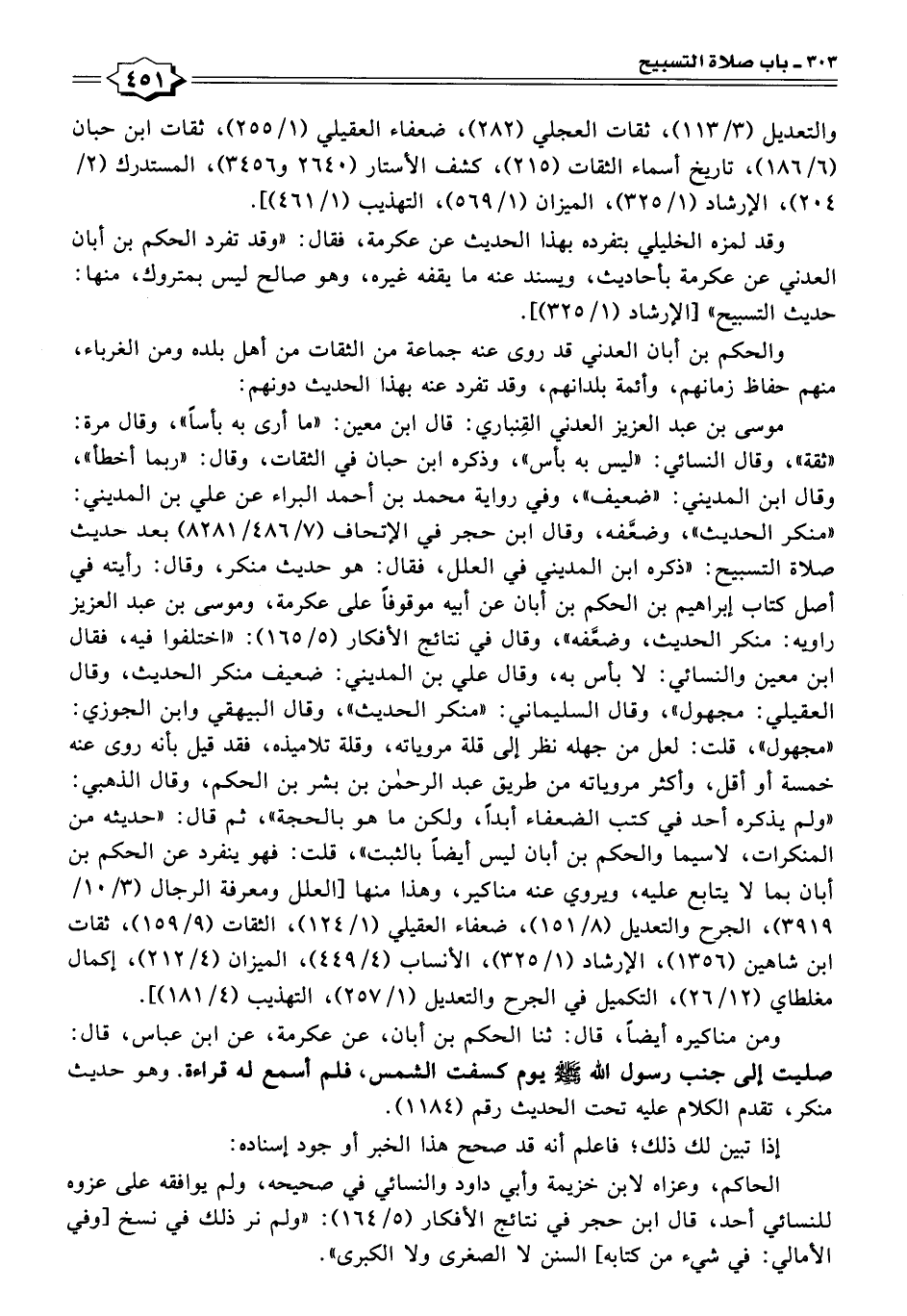 وقد لمزه الخليلي بتفرده بهذا الحديث عن عكرمة، فقال: "وقد تفرد الحكم بن أبان العدني عن عكرمة بأحاديث، ويسند عنه ما يقفه غيره، وهو صالح ليس بمتروك، منها: حديث التسبيح" [الإرشاد (١/ ٣٢٥)].