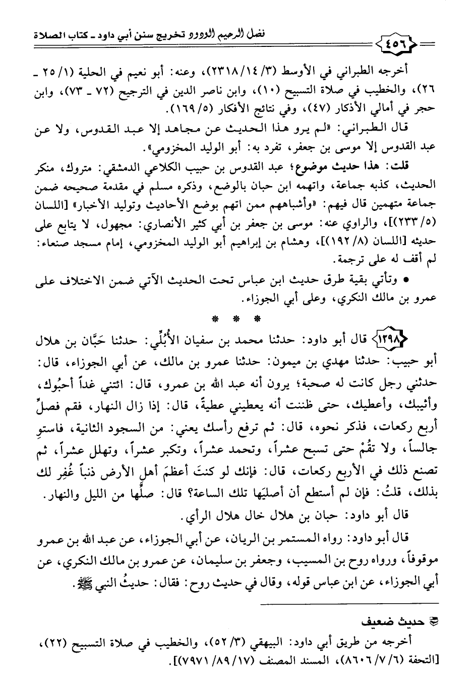 ١٢٩٨ - قال أبو داود: حدثنا محمد بن سفيان الأُبُلِّي: حدثنا حَبَّان بن هلال أبو حبيب: حدثنا مهدي بن ميمون: حدثنا عمرو بن مالك، عن أبي الجوزاء، قال: حدثني رجل كانت له صحبة؛ يرون أنه عبد الله بن عمرو، قال: ائتني غدًا أحبُوك، وأثيبك، وأعطيك، حتى ظننت أنه يعطيني عطيةً، قال: إذا زال النهار، فقم فصلِّ أربع ركعات، فذكر نحوه، قال: ثم ترفع رأسك يعني: من السجود الثانية، فاستوِ جالسًا، ولا تقُمْ حتى تسبح عشرًا، وتحمد عشرًا، وتكبر عشرًا، وتهلل عشرًا، ثم تصنع ذلك في الأربع ركعات، قال: فإنك لو كنتَ أعظمَ أهل الأرض ذنبًا غُفِر لك بذلك، قلتُ: فإن لم أستطع أن أصليَها تلك الساعة؟ قال: صلِّها من الليل والنهار.
