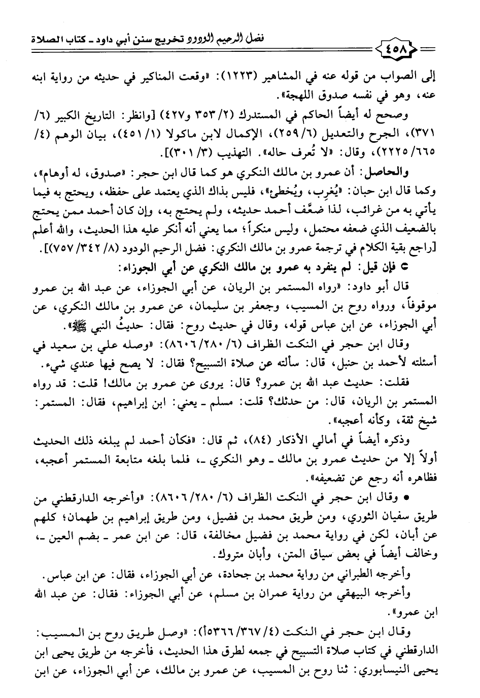 وقال ابن حجر في النكت (٤/ ٣٦٧/ ٥٣٦٦ أ): "وصل طريق روح بن المسيب: الدارقطني في كتاب صلاة التسبيح في جمعه لطرق هذا الحديث، فأخرجه من طريق يحيى بن يحيى النيسابوري: ثنا روح بن المسيب، عن عمرو بن مالك، عن أبي الجوزاء، عن ابن
