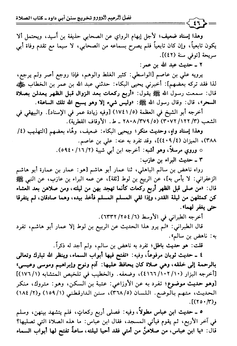 ٥ - حديث ابن عباس مطولًا، وفيه: فصلى أربع ركعاتٍ، فلم يتشهد بينهن، وسلم في آخر الأربع، ثم يقوم فيأتي المسجد، فقال ابن عباس: ما هذه الصلاة التي تصليها؟ قال: "يا ابن عباس، من صلاهنَّ من أمتي فقد أحيا ليلته، ساعةٌ تفتح لها أبواب السماء