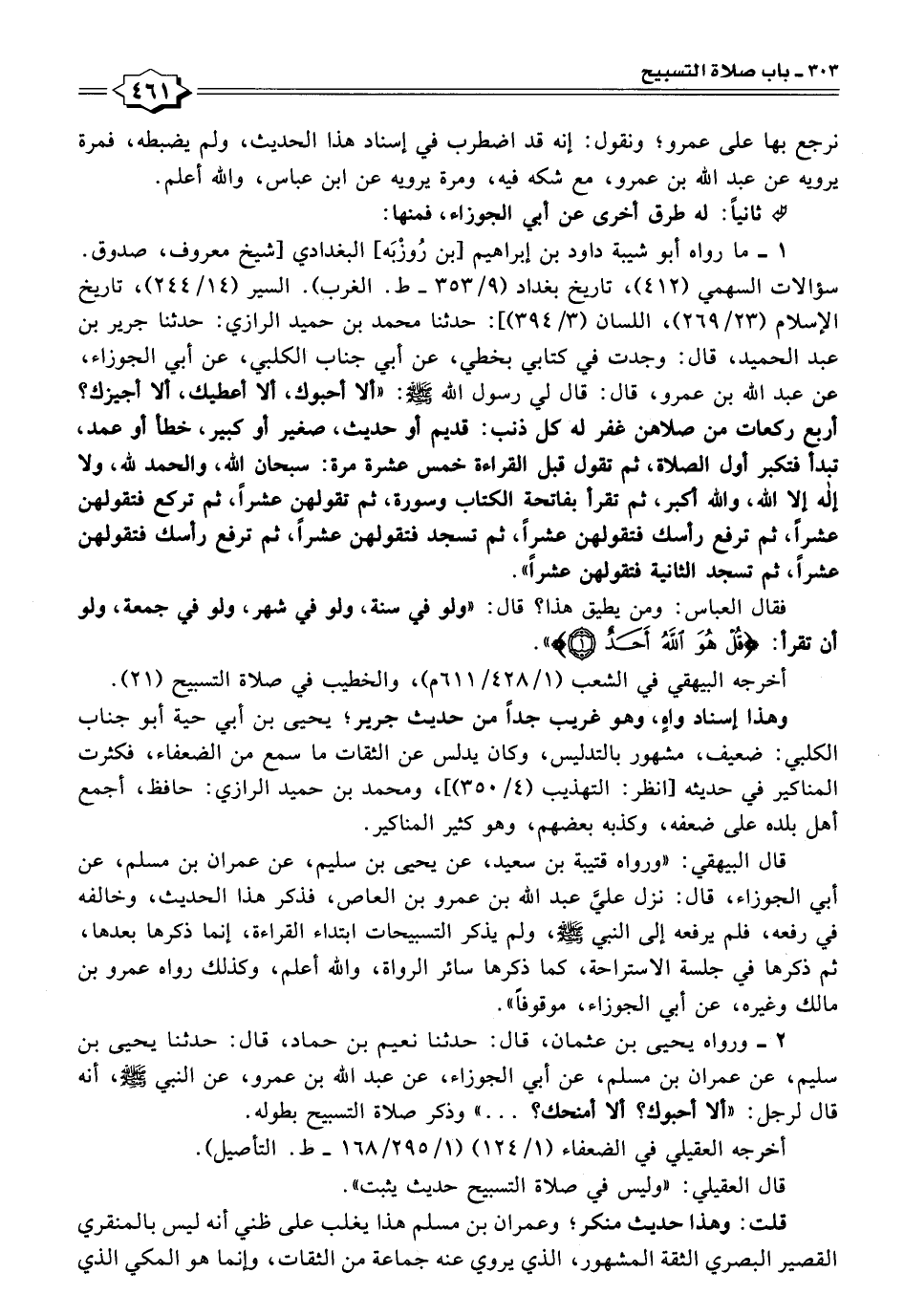 ١ - ما رواه أبو شيبة داود بن إبراهيم [بن رُوزْبَه] البغدادي [شيخ معروف، صدوق. سؤالات السهمي (٤١٢)، تاريخ بغداد (٩/ ٣٥٣ - ط. الغرب). السير (١٤/ ٢٤٤)، تاريخ الإسلام (٢٣/ ٢٦٩)، اللسان (٣/ ٣٩٤)]: حدثنا محمد بن حميد الرازي: حدثنا جرير بن عبد الحميد، قال: وجدت في كتابي بخطي، عن أبي جناب الكلبي، عن أبي الجوزاء، عن عبد الله بن عمرو، قال: قال لي رسول الله - صلى الله عليه وسلم -: "ألا أحبوك، ألا أعطيك، ألا أجيزك؟ أربع ركعات من صلاهن غفر له كل ذنب: قديم أو حديث، صغير أو كبير، خطأ أو عمد، تبدأ فتكبر أول الصلاة، ثم تقول قبل القراءة خمس عشرة مرة: سبحان الله، والحمد لله، ولا إله إلا الله، والله أكبر، ثم تقرأ بفاتحة الكتاب وسورة، ثم تقولهن عشرًا، ثم تركع فتقولهن عشرًا، ثم ترفع رأسك فتقولهن عشرًا، ثم تسجد فتقولهن عشرًا، ثم ترفع رأسك فتقولهن عشرًا، ثم تسجد الثانية فتقولهن عشرًا".