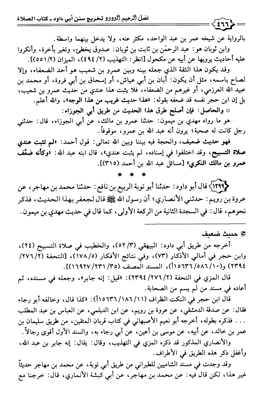 ١٢٩٩ - قال أبو داود: حدثنا أبو توبة الربيع بن نافع: حدثنا محمد بن مهاجر، عن عروة بن رويم: حدثني الأنصاري؛ أن رسول الله - صلى الله عليه وسلم - قال لجعفر بهذا الحديث، فذكر نحوهم، قال: في السجدة الثانية من الركعة الأولى، كما قال في حديث مهدي بن ميمون.