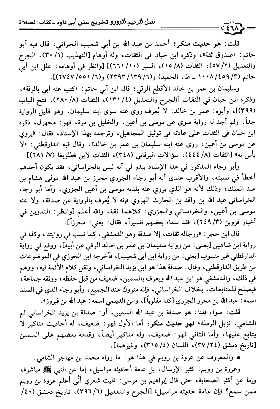 وعروة بن رويم: كثير الإرسال، بل عامة أحاديثه مراسيل، إما عن النبي - صلى الله عليه وسلم - مباشرة، وإما عن أكثر الصحابة، حتى قال إبراهيم بن موسى: "ليت شعري أنَّى أعلم عروة بن رويم ممن سمع؟ فإن عامة حديثه مراسيل" [الجرح والتعديل (٦/ ٣٩٦)، تاريخ دمشق (٤٠/
