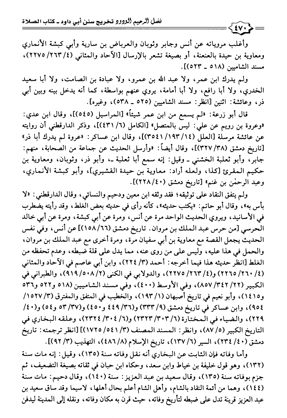 ولم يتفق النقاد على توثيقه؛ فقد وثقه ابن معين ودحيم والنسائي، وقال الدارقطني: "لا بأس به"، وقال أبو حاتم: "يكتب حديثه"، كأنه رأى في حديثه بعض الغلط، وقد رأيته يضطرب في الأسانيد، ويروي الحديث الواحد مرة عن أنس، ومرة عن أبي كبشة، ومرة عن أبي خالد الحرسي [من حرس عبد الملك بن مروان. تاريخ دمشق (٦٦/ ١٥٨)] عن أنس، وفي نفس الحديث يجعل القصة مع معاوية بن أبي سفيان مرة، ومرة أخرى مع عبد الملك بن مروان، والحمل في هذا عليه، وليس على من روى عنه، مما يدل على قلة ضبطه، وعدم تحفظه من الغلط [انظر حديثه هذا فيما أخرجه: أحمد (٣/ ٢٢٤)، وابن أبي عاصم في الآحاد والمثاني (٤/ ٢٦٠/ ٢٢٦٥) و (٤/ ٢٦٣/ ٢٢٧٥)، والدولابي في الكنى (٢/ ٥٠٨/ ٩١٩)، والطبراني في الكبير (٢٢/ ٨٥٧/٣٤٢)، وفي الأوسط (٤٠٠)، وفي مسند الشاميين (٥١٨ و ٥٢٢ و ٥٣٦ و ١٤١٥)، وأبو نعيم في تاريخ أصبهان (١/ ١٩٣)، والخطيب في المتفق والمفترق (٣/ ١٥٢٧/ ٩٥٤)، وابن عساكر في تاريخ دمشق (٩/ ٣٣٣) و (٣٦/ ٤٤٩ و ٤٥٠) و (٣٧/ ٥٣ و ٥٤) و (٤٠/ ٢٢٩)، والضياء في المختارة (٦/ ٣٠٣/ ٢٣٢٣) و (٦/ ٣٠٤/ ٢٣٢٤)، وعلقه البخاري في التاريخ الكبير (٥/ ٨٧)، وانظر: المسند المصنف (٣/ ٥٤١/ ١٧٢٥)] [نظر ترجمته: تاريخ دمشق (٤٠/ ٢٣٤)، السير (٦/ ١٣٧)، تاريخ الإسلام (٨/ ٤٨٦)، التهذيب (٣/ ٩٢)].