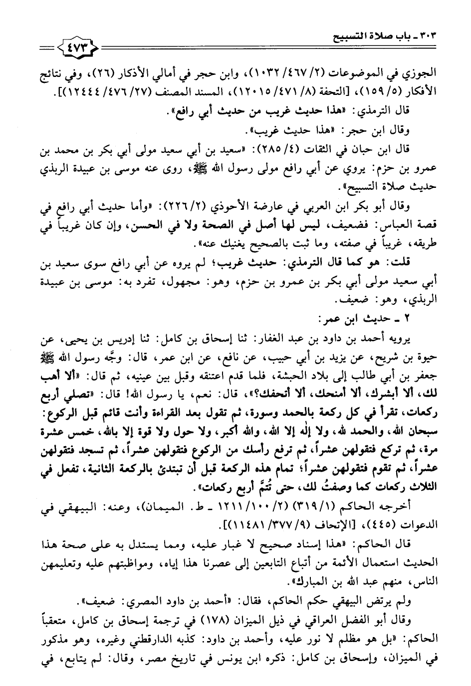 يرويه أحمد بن داود بن عبد الغفار: ثنا إسحاق بن كامل: ثنا إدريس بن يحيى، عن حيوة بن شريح، عن يزيد بن أبي حبيب، عن نافع، عن ابن عمر، قال: وجَّه رسول الله - صلى الله عليه وسلم - جعفر بن أبي طالب إلى بلاد الحبشة، فلما قدم اعتنقه وقبل بين عينيه، ثم قال: "ألا أهب لك، ألا أبشرك، ألا أمنحك، ألا أتحفك؟ "، قال: نعم، يا رسول الله! قال: "تصلي أربع ركعات، تقرأ في كل ركعة بالحمد وسورة، ثم تقول بعد القراءة وأنت قائم قبل الركوع: سبحان الله، والحمد لله، ولا إله إلا الله، والله أكبر، ولا حول ولا قوة إلا بالله، خمس عشرة مرة، ثم تركع فتقولهن عشرًا، ثم ترفع رأسك من الركوع فتقولهن عشرًا، ثم تسجد فتقولهن عشرًا، ثم تقوم فتقولهن عشرًا؛ تمام هذه الركعة قبل أن تبتدئ بالركعة الثانية، تفعل في الثلاث ركعات كما وصفتُ لك، حتى تُتمَّ أربع ركعات".