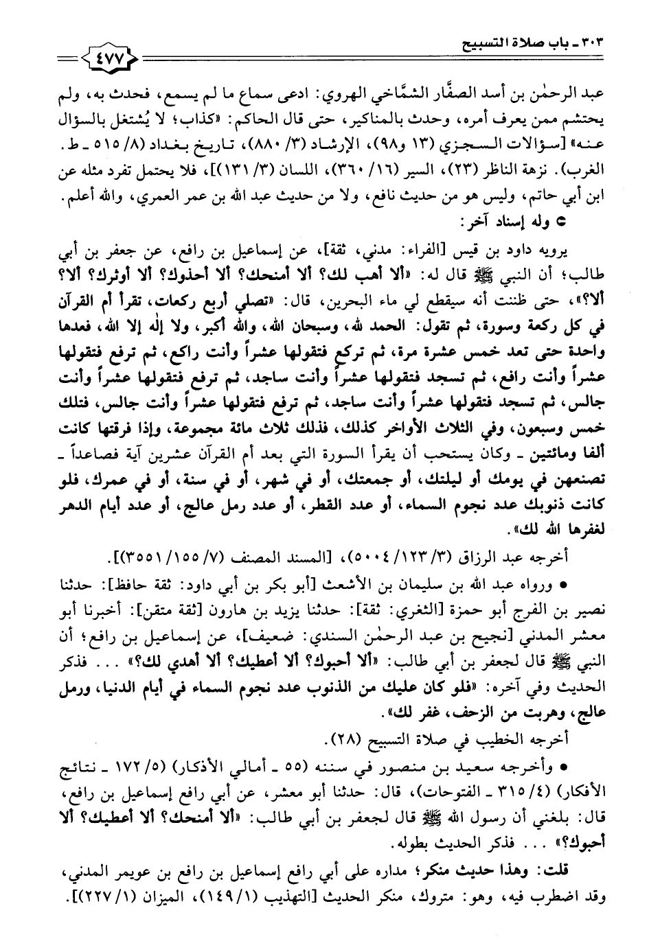 يرويه داود بن قيس [الفراء: مدني، ثقة]، عن إسماعيل بن رافع، عن جعفر بن أبي طالب؛ أن النبي - صلى الله عليه وسلم - قال له: "ألا أهب لك؟ ألا أمنحك؟ ألا أحذوك؟ ألا أوثرك؟ ألا؟ ألا؟ "، حتى ظننت أنه سيقطع لي ماء البحرين، قال: "تصلي أربع ركعات، تقرأ أم القرآن في كل ركعة وسورة، ثم تقول: الحمد لله، وسبحان الله، والله أكبر، ولا إله إلا الله، فعدها واحدة حتى تعد خمس عشرة مرة، ثم تركع فتقولها عشرًا وأنت راكع، ثم ترفع فتقولها عشرًا وأنت رافع، ثم تسجد فتقولها عشرًا وأنت ساجد، ثم ترفع فتقولها عشرًا وأنت جالس، ثم تسجد فتقولها عشرًا وأنت ساجد، ثم ترفع فتقولها عشرًا وأنت جالس، فتلك خمس وسبعون، وفي الثلاث الأواخر كذلك، فذلك ثلاث مائة مجموعة، وإذا فرقتها كانت ألفا ومائتين - وكان يستحب أن يقرأ السورة التي بعد أم القرآن عشرين آية فصاعدًا - تصنعهن في يومك أو ليلتك، أو جمعتك، أو في شهر، أو في سنة، أو في عمرك، فلو كانت ذنوبك عدد نجوم السماء، أو عدد القطر، أو عدد رمل عالج، أو عدد أيام الدهر لغفرها الله لك".
