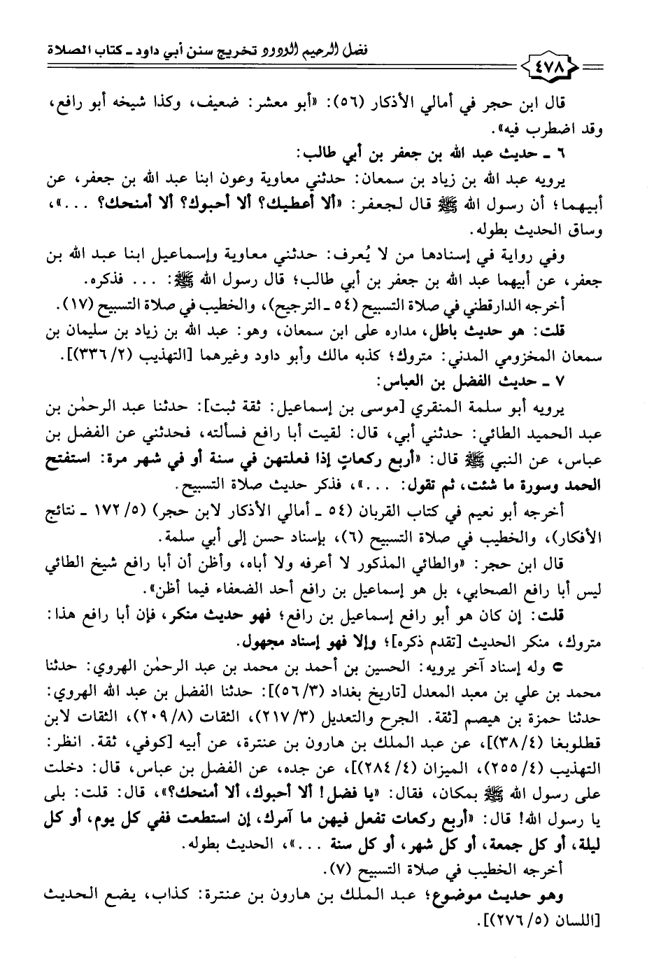 يرويه أبو سلمة المنقري [موسى بن إسماعيل: ثقة ثبت]: حدثنا عبد الرحمن بن عبد الحميد الطائي: حدثني أبي، قال: لقيت أبا رافع فسألته، فحدثني عن الفضل بن عباس، عن النبي - صلى الله عليه وسلم - قال: "أربع ركعاتٍ إذا فعلتهن في سنة أو في شهر مرة: استفتح الحمد وسورة ما شئت، ثم تقول:. . ."، فذكر حديث صلاة التسبيح.