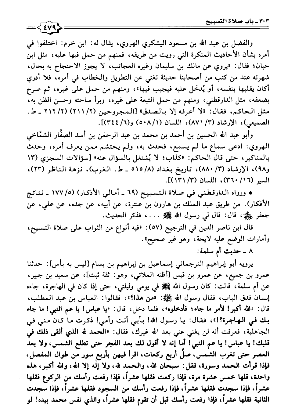 يرويه أبو إبراهيم الترجماني إسماعيل بن إبراهيم بن بسام [ليس به بأس]: حدثنا عمرو بن جميع، عن عمرو بن قيس [أظنه الملائي، وهو: ثقة ثبت]، عن سعيد بن جبير، عن أم سلمة، قالت: كان رسول الله - صلى الله عليه وسلم - في يومي وليلتي، حتى إذا كان في الهاجرة، جاءه إنسان فدق الباب، فقال رسول الله - صلى الله عليه وسلم -: "من هذا؟ "، فقالوا: العباس بن عبد المطلب، قال: "الله أكبر! لأمر ما جاء؛ فأدخلوه"، فلما دخل، قال: "يا عباس! يا عم النبي! ما جاء بك في الهاجرة؟! "، فقال: يا رسول الله! بأبي أنت وأمي! ذكرت ما كان مني في الجاهلية، فعرفت أنه لن يغني عني بعد الله غيرك، فقال: "الحمد الله الذي ألقى ذلك في قلبك! يا عباس! يا عم النبي! أما إنه لا أقول لك بعد الفجر حتى تطلع الشمس، ولا بعد العصر حتى تغرب الشمس، صلِّ أربع ركعات، اقرأ فيهن بأربع سور من طوال المفصل، فإذا قرأت الحمد وسورة، فقل: سبحان الله، والحمد الله، ولا إله الا الله، والله أكبر، هذه واحدة، قلها خمس عشرة مرة، فإذا ركعت فقلها عشرًا، فإذا رفعت رأسك من الركوع فقلها عشرًا، فإذا سجدت فقلها عشرًا، فإذا رفعت رأسك من السجود فقلها عشرًا، فإذا سجدت الثانية فقلها عشرًا، فإذا رفعت رأسك قبل أن تقوم فقلها عشرًا، والذي نفس محمد بيده! لو