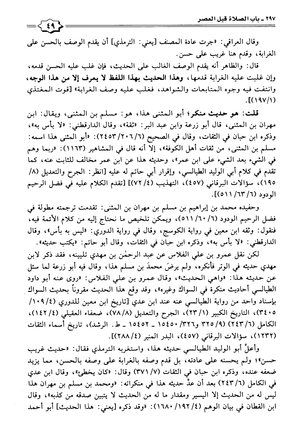 قلت: هو حديث منكر؛ أبو المثنى هذا، هو: مسلم بن المثنى، ويقال: ابن مهران بن المثنى، قال أبو زرعة وابن عبد البر: "ثقة"، وقال الدارقطني: "لا بأس به"، وذكره ابن حبان في الثقات، وقال في الصحيح (٦/ ٢٠٦/ ٢٤٥٣): "أبو المثنى هذا اسمه: مسلم بن المثنى، من ثقات أهل الكوفة"، إلا أنه قال في المشاهير (١١٦٣): "ربما وهم في الشيء بعد الشيء على ابن عمر"، وحديثه هذا عن ابن عمر مخالف للثابت عنه، كما تقدم في كلام أبي الوليد الطيالسي، وإقرار أبي حاتم له عليه [انظر: الجرح والتعديل (٨/ ١٩٥)، سؤالات البرقاني (٤٥٧)، التهذيب (٤/ ٧٢)، [تقدم الكلام عليه في فضل الرحيم الودود (٦/ ٦٣/ ٥١١)].
