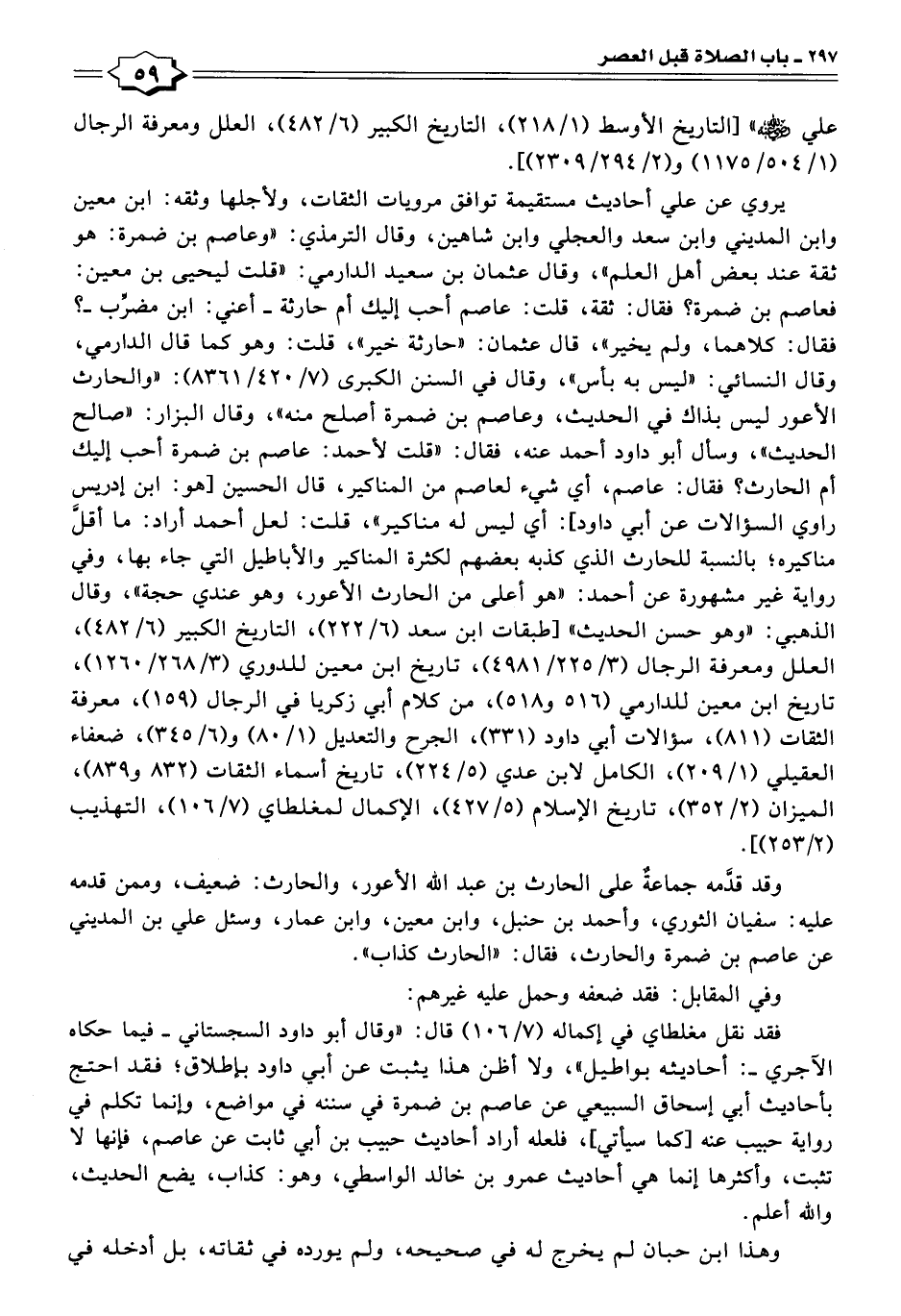 يروي عن علي أحاديث مستقيمة توافق مرويات الثقات، ولأجلها وثقه: ابن معين وابن المديني وابن سعد والعجلي وابن شاهين، وقال الترمذي: "وعاصم بن ضمرة: هو ثقة عند بعض أهل العلم"، وقال عثمان بن سعيد الدارمي: "قلت ليحيى بن معين: فعاصم بن ضمرة؟ فقال: ثقة، قلت: عاصم أحب إليك أم حارثة - أعني: ابن مضرِّب -؟ فقال: كلاهما، ولم يخير"، قال عثمان: "حارثة خير"، قلت: وهو كما قال الدارمي، وقال النسائي: "ليس به بأس"، وقال في السنن الكبرى (٧/ ٤٢٠/ ٨٣٦١): "والحارث الأعور ليس بذاك في الحديث، وعاصم بن ضمرة أصلح منه"، وقال البزار: "صالح الحديث"، وسأل أبو داود أحمد عنه، فقال: "قلت لأحمد: عاصم بن ضمرة أحب إليك أم الحارث؟ فقال: عاصم، أي شيء لعاصم من المناكير، قال الحسين [هو: ابن إدريس راوي السؤالات عن أبي داود]: أي ليس له مناكير"، قلت: لعل أحمد أراد: ما أقلَّ مناكيره؛ بالنسبة للحارث الذي كذبه بعضهم لكثرة المناكير والأباطيل التي جاء بها، وفي رواية غير مشهورة عن أحمد: "هو أعلى من الحارث الأعور، وهو عندي حجة"، وقال الذهبي: "وهو حسن الحديث" [طبقات ابن سعد (٦/ ٢٢٢)، التاريخ الكبير (٦/ ٤٨٢)، العلل ومعرفة الرجال (٣/ ٢٢٥/ ٤٩٨١)، تاريخ ابن معين للدوري (٣/ ٢٦٨/ ١٢٦٠)، تاريخ ابن معين للدارمي (٥١٦ و ٥١٨)، من كلام أبي زكريا في الرجال (١٥٩)، معرفة الثقات (٨١١)، سؤالات أبي داود (٣٣١)، الجرح والتعديل (١/ ٨٠) و (٦/ ٣٤٥)، ضعفاء العقيلي (١/ ٢٠٩)، الكامل لابن عدي (٥/ ٢٢٤)، تاريخ أسماء الثقات (٨٣٢ و ٨٣٩)، الميزان (٢/ ٣٥٢)، تاريخ الإسلام (٥/ ٤٢٧)، الإكمال لمغلطاي (٧/ ١٠٦)، التهذيب (٢/ ٢٥٣)].