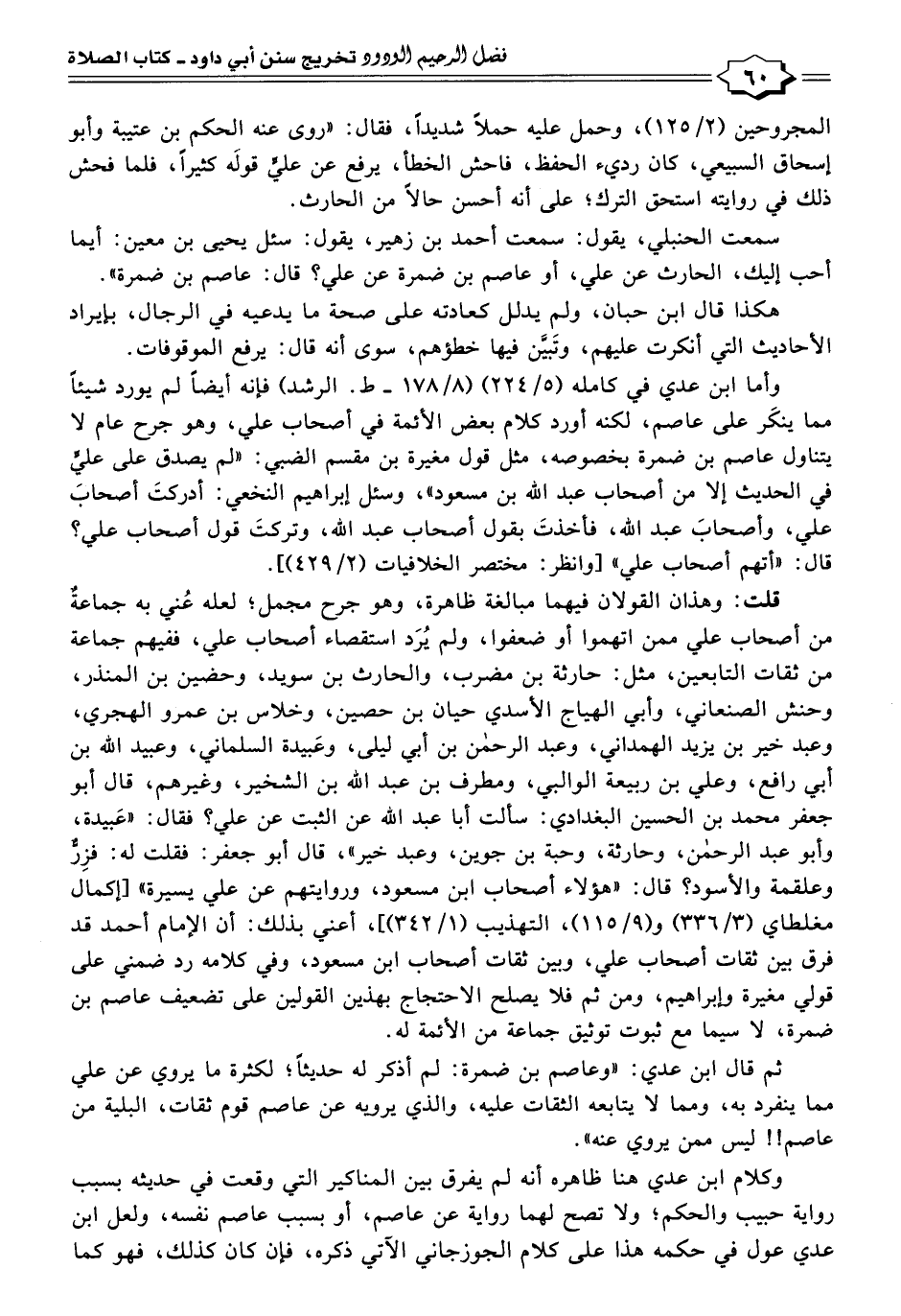 وأما ابن عدي في كامله (٥/ ٢٢٤) (٨/ ١٧٨ - ط. الرشد) فإنه أيضًا لم يورد شيئًا مما ينكَر على عاصم، لكنه أورد كلام بعض الأئمة في أصحاب علي، وهو جرح عام لا يتناول عاصم بن ضمرة بخصوصه، مثل قول مغيرة بن مقسم الضبي: "لم يصدق على عليٍّ في الحديث إلا من أصحاب عبد الله بن مسعود"، وسئل إبراهيم النخعي: أدركتَ أصحابَ علي، وأصحابَ عبد الله، فأخذتَ بقول أصحاب عبد الله، وتركتَ قول أصحاب علي؟ قال: "أتهم أصحاب علي" [وانظر: مختصر الخلافيات (٢/ ٤٢٩)].