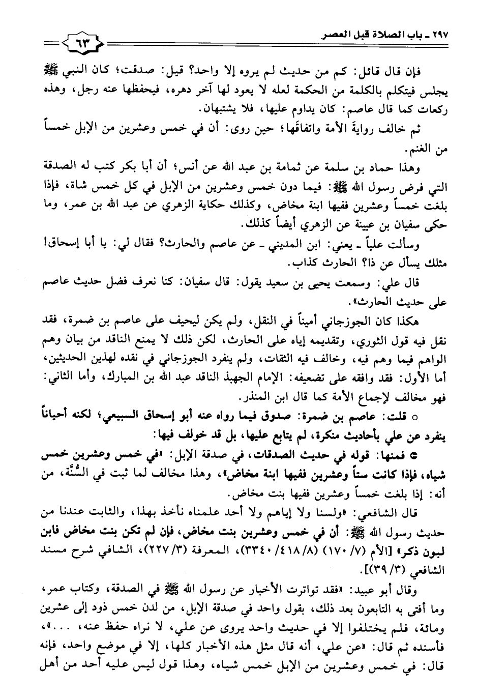 وقال أبو عبيد: "فقد تواترت الأخبار عن رسول الله - صلى الله عليه وسلم - في الصدقة، وكتاب عمر، وما أفتى به التابعون بعد ذلك، بقول واحد في صدقة الإبل، من لدن خمس ذود إلى عشرين ومائة، فلم يختلفوا إلا في حديث واحد يروى عن علي، لا نراه حفظ عنه، ... "، فأسنده ثم قال: "عن علي، أنه قال مثل هذه الأخبار كلها، إلا في موضع واحد، فإنه قال: في خمس وعشرين من الإبل خمس شياه، وهذا قول ليس عليه أحد من أهل