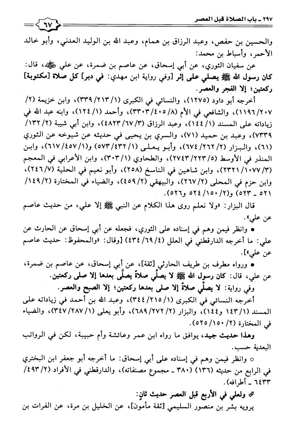 عن سفيان الثوري، عن أبي إسحاق، عن عاصم بن ضمرة، عن علي - رضي الله عنه -، قال: كان رسول الله - صلى الله عليه وسلم - يصلي على إثر [وفي رواية ابن مهدي: في دبر، كل صلاة [مكتوبة] ركعتين؛ إلا الفجر والعصر.