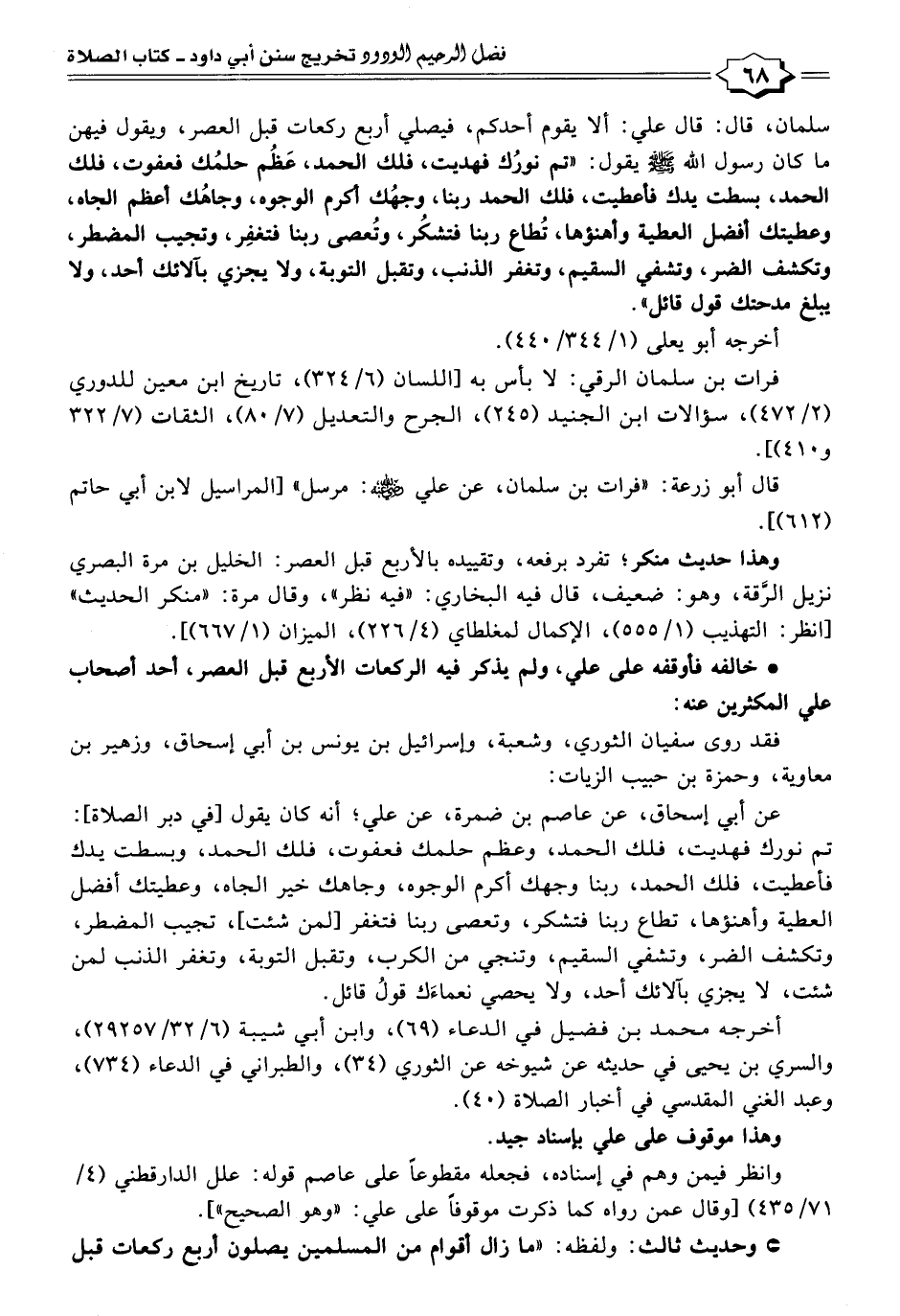 سلمان، قال: قال علي: ألا يقوم أحدكم، فيصلي أربع ركعات قبل العصر، ويقول فيهن ما كان رسول الله - صلى الله عليه وسلم - يقول: "تم نورُك فهديت، فلك الحمد، عَظُم حلمُك فعفوت، فلك الحمد، بسطت يدك فأعطيت، فلك الحمد ربنا، وجهُك أكرم الوجوه، وجاهُك أعظم الجاه، وعطيتك أفضل العطية وأهنؤها، تُطاع ربنا فتشكُر، وتُعصى ربنا فتغفِر، وتجيب المضطر، وتكشف الضر، وتشفي السقيم، وتغفر الذنب، وتقبل التوبة، ولا يجزي بآلائك أحد، ولا يبلغ مدحتك قول قائل".