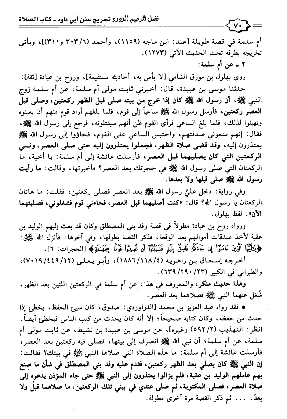 وفي رواية: دخل عليَّ رسول الله - صلى الله عليه وسلم - بعد العصر فصلى ركعتين، فقلت: ما هاتان الركعتان يا رسول الله؟ قال: "كنت أصليهما قبل العصر، فجاءني قوم فشغلوني، فصليتهما الآن". لفظ بهلول.