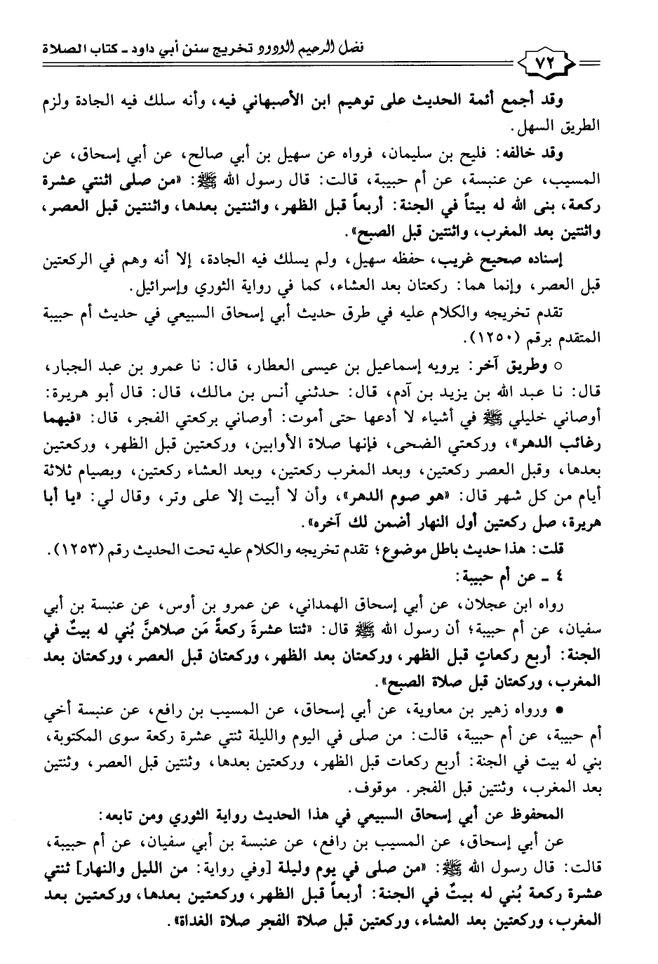 عن أبي إسحاق، عن المسيب بن رافع، عن عنبسة بن أبي سفيان، عن أم حبيبة، قالت: قال رسول الله -صلى الله عليه وسلم-: "من صلى في يوم وليلة [وفي رواية: من الليل والنهار] ثنتي عشرة ركعة بُني له بيتٌ في الجنة: أربعًا قبل الظهر، وركعتين بعدها، وركعتين بعد المغرب، وركعتين بعد العشاء، وركعتين قبل صلاة الفجر صلاة الغداة".