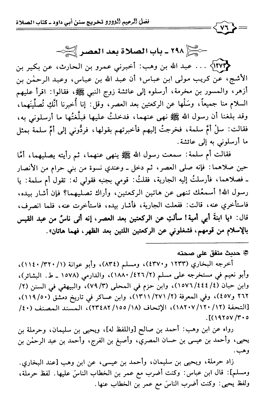 ١٢٧٣ - . . . عبد الله بن وهب: أخبرني عمرو بن الحارث، عن بكير بن الأشج، عن كريب مولى ابن عباس؛ أن عبد الله بن عباس، وعبد الرحمن بن أزهر، والمسور بن مخرمة، أرسلوه إلى عائشة زوج النبي -صلى الله عليه وسلم-، فقالوا: اقرأ عليهم السلام منا جميعًا، وسَلْها عن الركعتين بعد العصر، وقل: إنا أُخبرنا أنَّكِ تُصلِّينَهما، وقد بلغنا أن رسول الله -صلى الله عليه وسلم- نهى عنهما، فدخلتُ عليها فبلَّغتُها ما أرسلوني به، فقالت: سلْ أمَّ سلمة، فخرجتُ إليهم فأخبرتهم بقولها، فردُّوني إلى أمِّ سلمة بمثل ما أرسلوني به إلى عائشة.