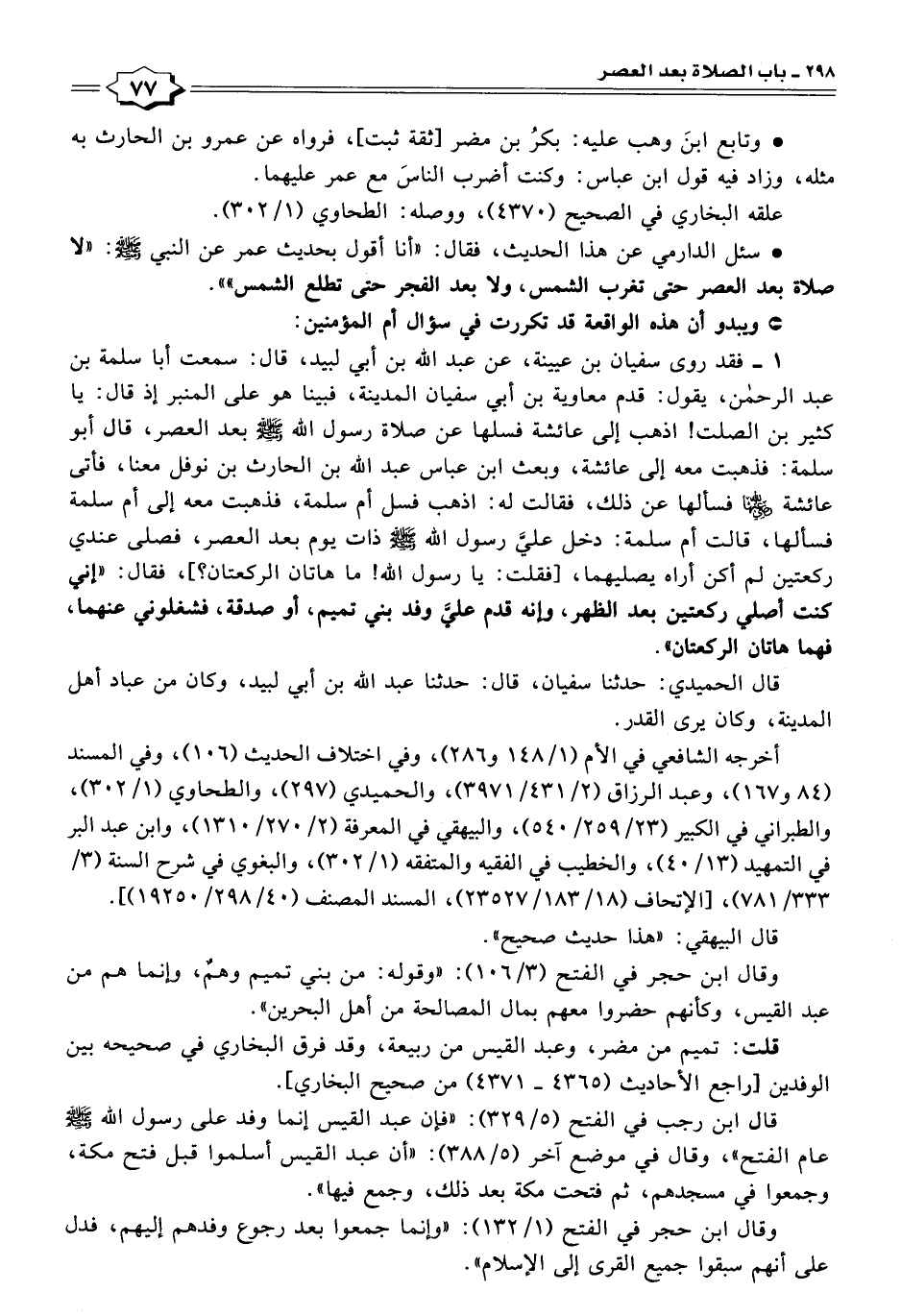 ١ - فقد روى سفيان بن عيينة، عن عبد الله بن أبي لبيد، قال: سمعت أبا سلمة بن عبد الرحمن، يقول: قدم معاوية بن أبي سفيان المدينة، فبينا هو على المنبر إذ قال: يا كثير بن الصلت! اذهب إلى عائشة فسلها عن صلاة رسول الله -صلى الله عليه وسلم- بعد العصر، قال أبو سلمة: فذهبت معه إلى عائشة، وبعث ابن عباس عبد الله بن الحارث بن نوفل معنا، فأتى عائشة -رضي الله عنها- فسألها عن ذلك، فقالت له: اذهب فسل أم سلمة، فذهبت معه إلى أم سلمة فسألها، قالت أم سلمة: دخل عليَّ رسول الله -صلى الله عليه وسلم- ذات يوم بعد العصر، فصلى عندي ركعتين لم أكن أراه يصليهما، [فقلت: يا رسول الله! ما هاتان الركعتان؟]، فقال: "إني كنت أصلي ركعتين بعد الظهر، وإنه قدم عليَّ وفد بني تميم، أو صدقة، فشغلوني عنهما، فهما هاتان الركعتان".