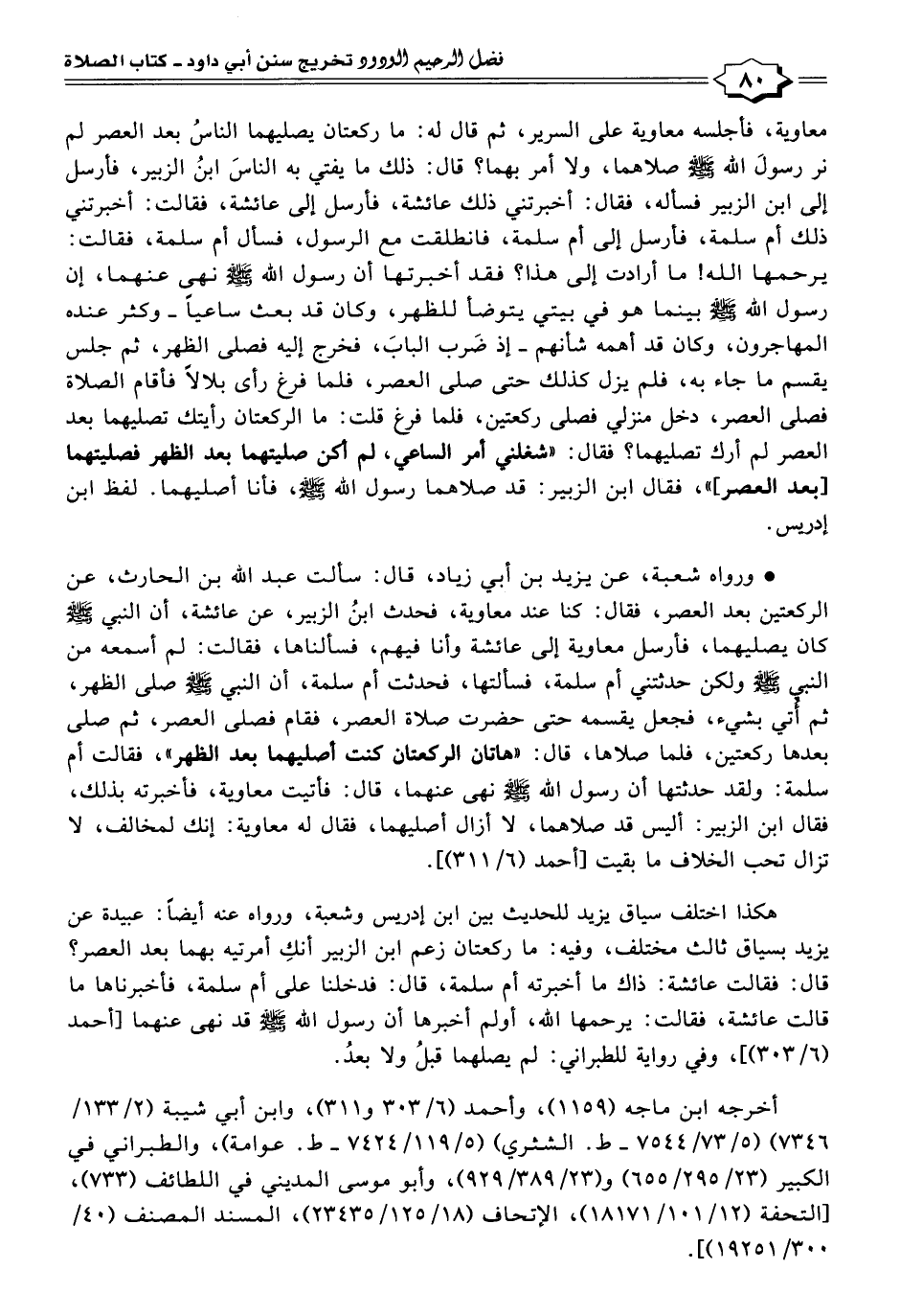 * ورواه شعبة، عن يزيد بن أبي زياد، قال: سألت عبد الله بن الحارث، عن الركعتين بعد العصر، فقال: كنا عند معاوية، فحدث ابنُ الزبير، عن عائشة، أن النبي -صلى الله عليه وسلم- كان يصليهما، فأرسل معاوية إلى عائشة وأنا فيهم، فسألناها، فقالت: لم أسمعه من النبي -صلى الله عليه وسلم- ولكن حدثتني أم سلمة، فسألتها، فحدثت أم سلمة، أن النبي -صلى الله عليه وسلم- صلى الظهر، ثم أُتي بشيء، فجعل يقسمه حتى حضرت صلاة العصر، فقام فصلى العصر، ثم صلى بعدها ركعتين، فلما صلاها، قال: "هاتان الركعتان كنت أصليهما بعد الظهر"، فقالت أم سلمة: ولقد حدثتها أن رسول الله -صلى الله عليه وسلم- نهى عنهما، قال: فأتيت معاوية، فأخبرته بذلك، فقال ابن الزبير: أليس قد صلاهما، لا أزال أصليهما، فقال له معاوية: إنك لمخالف، لا تزال تحب الخلاف ما بقيت [أحمد (٦/ ٣١١)].