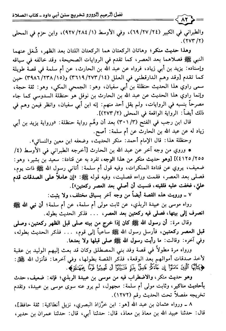 وهذا حديث منكر؛ وهاتان الركعتان هما الركعتان اللتان بعد الظهر، شُغل عنهما النبي -صلى الله عليه وسلم- فصلاهما بعد العصر، كما تقدم في الروايات الصحيحة، وقد خالفه في سياقه وإسناده: يزيد بن أبي زياد، فرواه عن عبد الله بن الحارث، عن أم سلمة في قصة طويلة كما تقدم [وقد وهم الدارقطني في العلل (١٤/ ٢٧٣/ ٣٦١٩) و (١٥/ ٢٣٨/ ٣٩٨٦) حين سمى راوي هذا الحديث حنظلة بن أبي سفيان، وهو: الجمحي المكي، وهو: ثقة حجة، وإنما راوي هذا الحديث عن عبد الله بن الحارث بن نوفل هو حنظلة السدوسي كما جاء مصرحًا بنسبه في الروايات، ولم يقل أحد منهم: إنه ابن أبي سفيان، وانظر فيمن وهم في ذلك أيضًا: الرواية الواقعة في المحلى (٢/ ٢٧٣)].