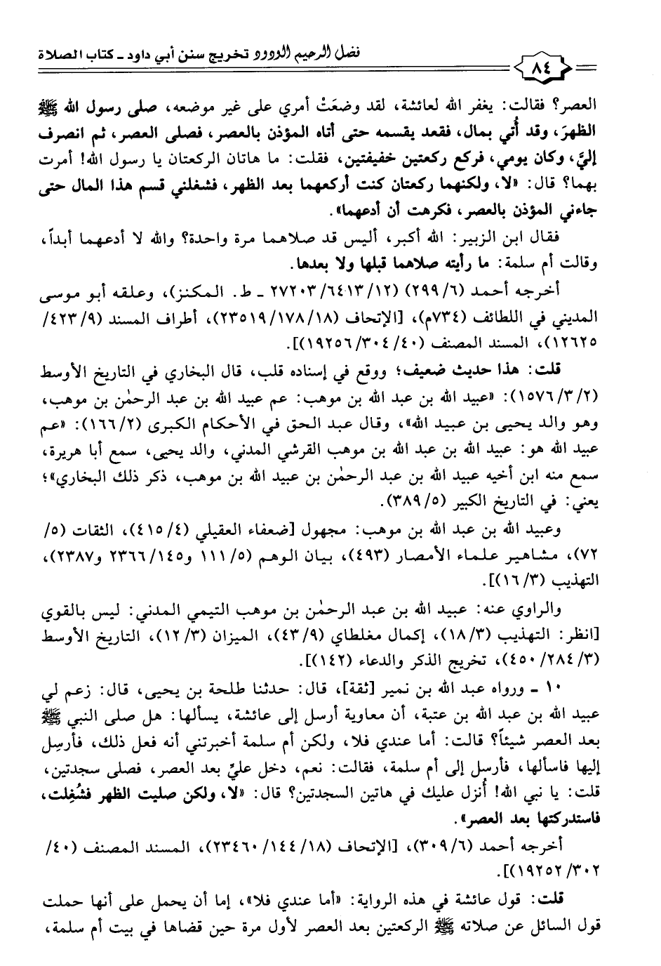 ١٠ - ورواه عبد الله بن نمير [ثقة]، قال: حدثنا طلحة بن يحيى، قال: زعم لي عبيد الله بن عبد الله بن عتبة، أن معاوية أرسل إلى عائشة، يسألها: هل صلى النبي -صلى الله عليه وسلم- بعد العصر شيئًا؟ قالت: أما عندي فلا، ولكن أم سلمة أخبرتني أنه فعل ذلك، فأرسِل إليها فاسألها، فأرسل إلى أم سلمة، فقالت: نعم، دخل عليِّ بعد العصر، فصلى سجدتين، قلت: يا نبي الله! أُنزل عليك في هاتين السجدتين؟ قال: "لا، ولكن صليت الظهر فشُغِلت، فاستدركتها بعد العصر".