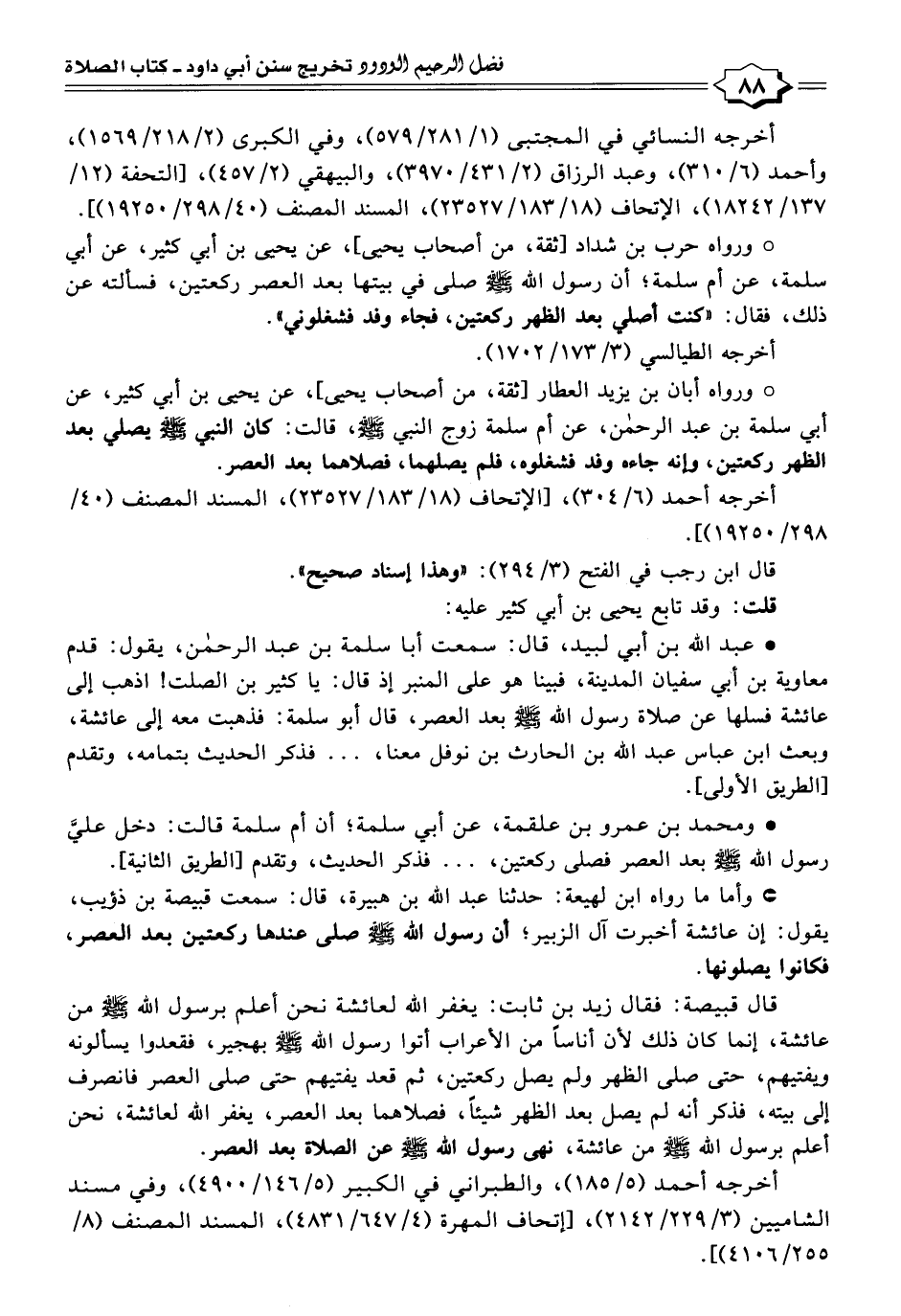 * ورواه أبان بن يزيد العطار [ثقة، من أصحاب يحيى]، عن يحيى بن أبي كثير، عن أبي سلمة بن عبد الرحمن، عن أم سلمة زوج النبي -صلى الله عليه وسلم-، قالت: كان النبي -صلى الله عليه وسلم- يصلي بعد الظهر ركعتين، وإنه جاءه وفد فشغلوه، فلم يصلهما، فصلاهما بعد العصر.