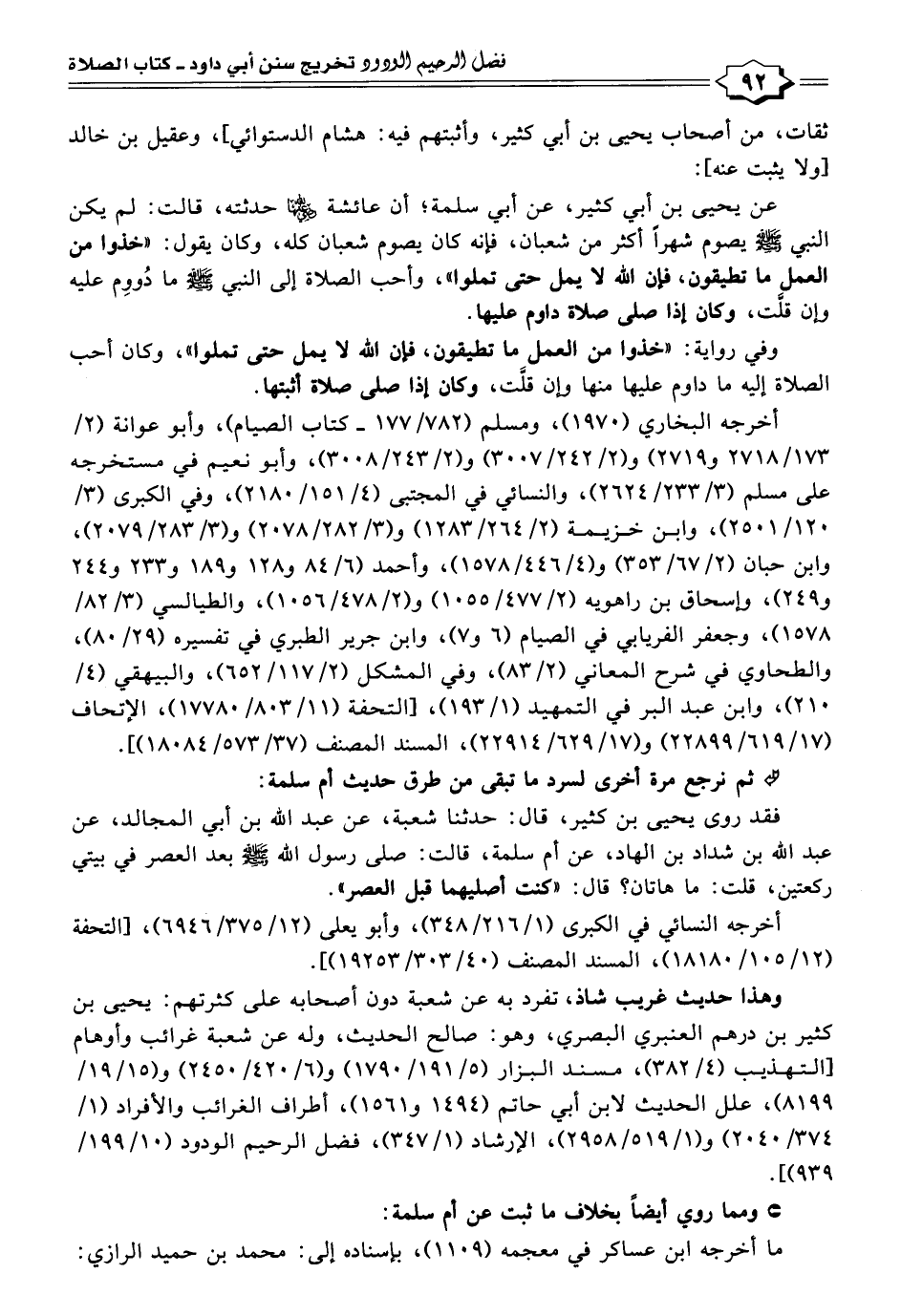 عن يحيى بن أبي كثير، عن أبي سلمة؛ أن عائشة -رضي الله عنها- حدثته، قالت: لم يكن النبي -صلى الله عليه وسلم- يصوم شهرًا أكثر من شعبان، فإنه كان يصوم شعبان كله، وكان يقول: "خذوا من العمل ما تطيقون، فإن الله لا يمل حتى تملوا"، وأحب الصلاة إلى النبي -صلى الله عليه وسلم- ما دُووِم عليه وإن قلَّت، وكان إذا صلى صلاة داوم عليها.