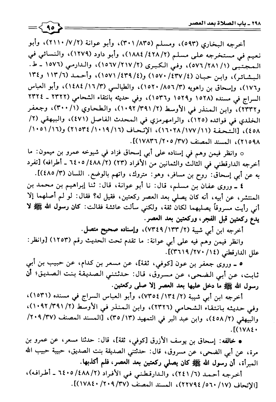 ٥ - وروى جعفر بن عون [كوفي، ثقة]، عن مسعر بن كدام، عن حبيب بن أبي ثابت، عن أبي الضحى، عن مسروق، قال: حدثتني الصديقة بنت الصديق؛ أن رسول الله -صلى الله عليه وسلم- ما دخل عليها بعد العصر إلا صلى ركعتين.