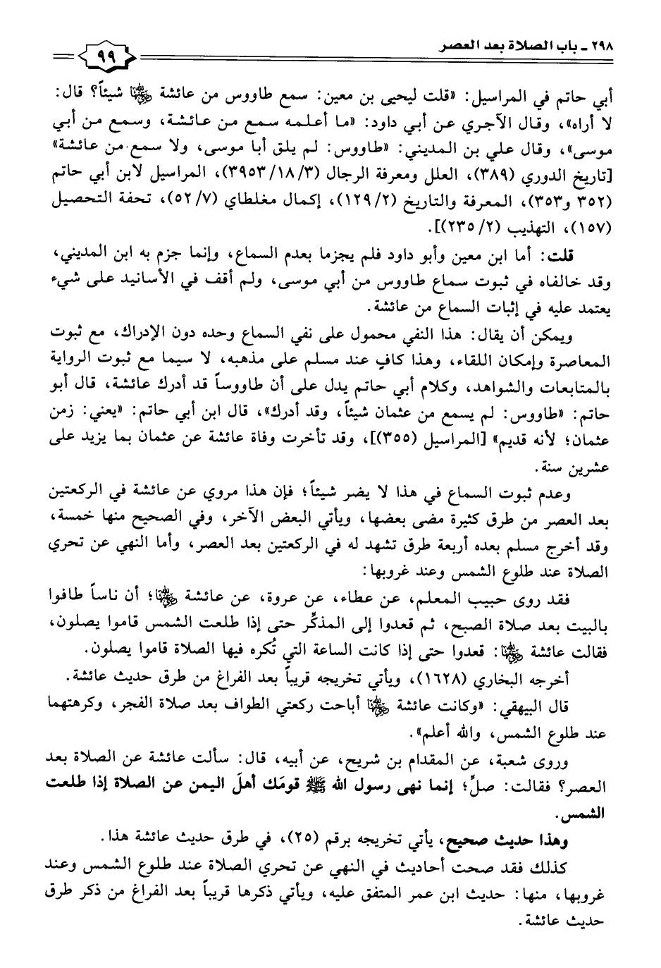 وعدم ثبوت السماع في هذا لا يضر شيئًا؛ فإن هذا مروي عن عائشة في الركعتين بعد العصر من طرق كثيرة مضى بعضها، ويأتي البعض الآخر، وفي الصحيح منها خمسة، وقد أخرج مسلم بعده أربعة طرق تشهد له في الركعتين بعد العصر، وأما النهي عن تحري الصلاة عند طلوع الشمس وعند غروبها: