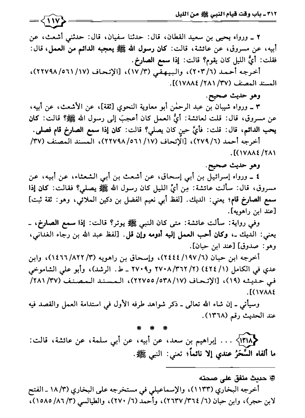 ٣ - ورواه شيبان بن عبد الرحمن أبو معاوية النحوي [ثقة]، عن الأشعث، عن أبيه، عن مسروق، قال: قلت لعائشة: أيُّ العمل كان أعجبَ إلى رسول اللّه - صلى الله عليه وسلم -؟ قالت: كان يحب الدائم، قال: قلت: فأيَّ حينٍ كان يصلي؟ قالت: كان إذا سمع الصارخ قام فصلى.