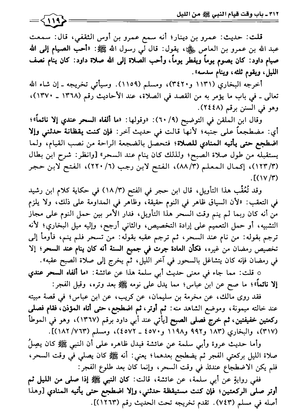 وقد تُعُقب هذا التأويل، قال ابن حجر في الفتح (٣/ ١٨) في حكاية كلام ابن رشيد في التعقب: "لأن السياق ظاهر في النوم حقيقة، وظاهر في المداومة على ذلك، ولا يلزم من أنه كان ربما لم ينم وقت السحر هذا التأويل، فدار الأمر بين حمل النوم على مجاز التشبيه، أو حمل التعميم على إرادة التخصيص، والثاني أرجح، وإليه ميل البخاري؛ لأنه ترجم بقوله: من نام عند السحر، ثم ترجم عقبه بقوله: من تسحر فلم ينم، فأومأ إلى تخصيص رمضان من غيره، فكان العادة جرت في جميع السنة أنه كان ينام عند السحر، إِلَّا في رمضان فإنه كان يتشاغل بالسحور في آخر الليل، ثم يخرج إلى صلاة الصبح عقبه".