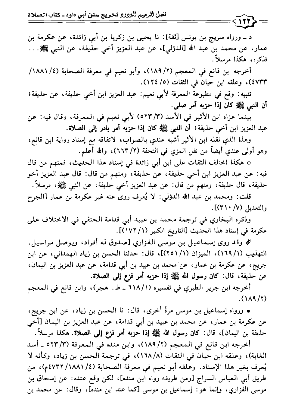 تنبيه؛ وقع في مطبوعة المعرفة لأبي نعيم: عبد العزيز ابن أخي حذيفة، عن حذيفة؛ أن النَّبِيّ - صلى الله عليه وسلم - كان إذا حزبه أمر صلى.