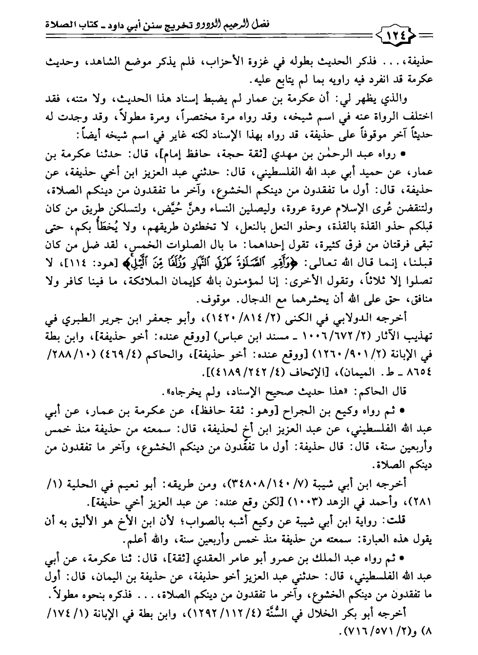 * ثم رواه عبد الملك بن عمرو أبو عامر العقدي [ثقة]، قال: ثنا عكرمة، عن أبي عبد الله الفلسطيني، قال: حَدَّثَنِي عبد العزيز أخو حذيفة، عن حذيفة بن اليمان، قال: أول ما تفقدون من دينكم الخشوع، وآخر ما تفقدون من دينكم الصلاة، ... فذكره بنحوه مطولًا.