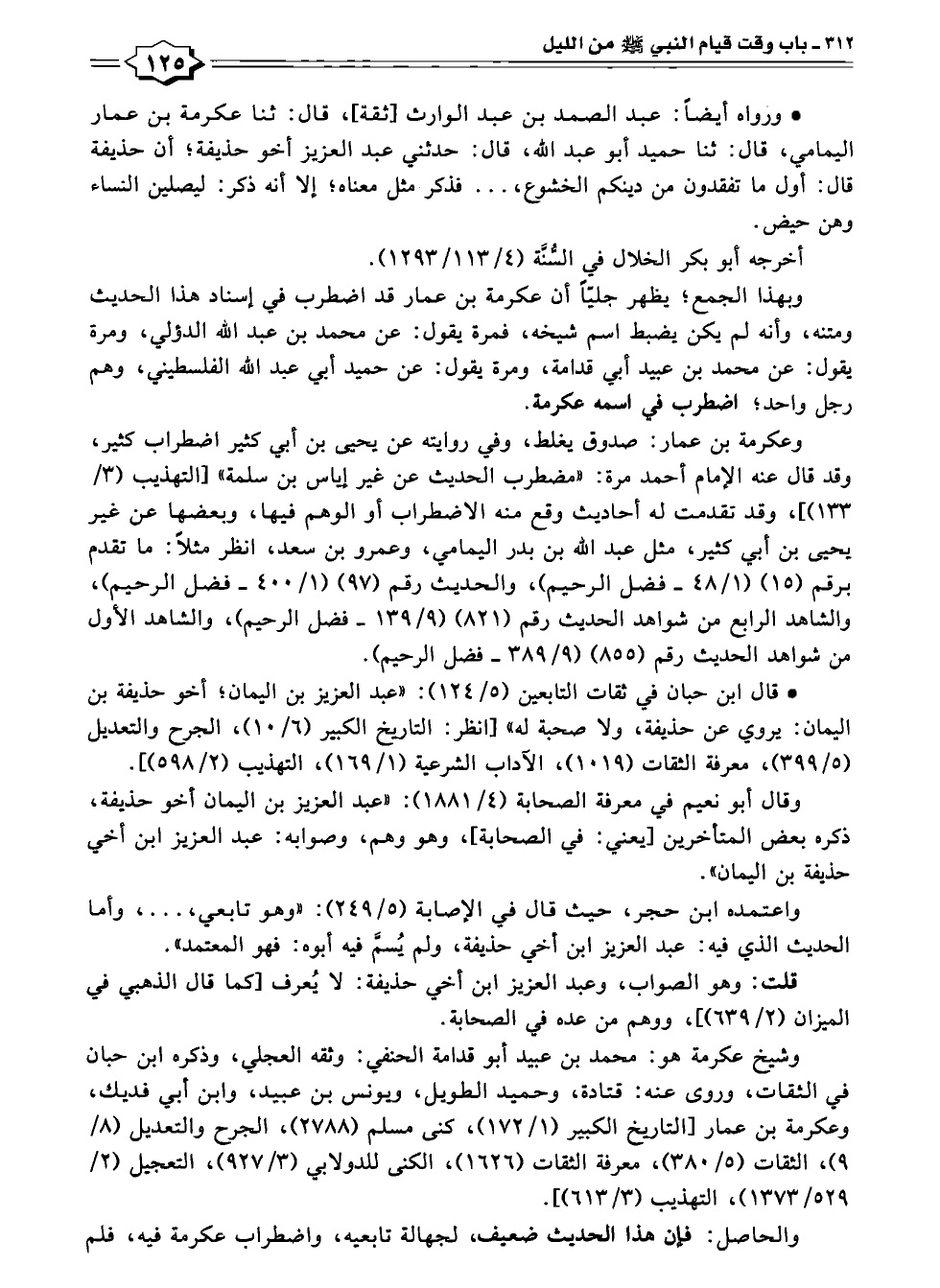 واعتمده ابن حجر، حيث قال في الإصابة (٥/ ٢٤٩): "وهو تابعي، ... ، وأما الحديث الذي فيه: عبد العزيز ابن أخي حذيفة، ولم يُسمَّ فيه أبوه: فهو المعتمد".