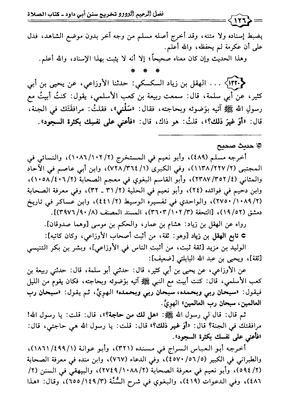 ١٣٢٠ - . . . الهقل بن زياد السكسكي: حَدَّثَنَا الأوزاعي، عن يحيى بن أبي كثير، عن أبي سلمة، قال: سمعت ربيعة بن كعب الأسلمي، يقول: كنتُ أبيتُ مع رسولِ الله - صلى الله عليه وسلم - آتيه بوَضوئه وبحاجته، فقال: "سَلْني"، فقلتُ: مرافقَتَك في الجنة، قال: "أوَ غيرَ ذلك؟ "، قلتُ: هو ذاك، قال: "فأعني على نفسِك بكثرة السجود".