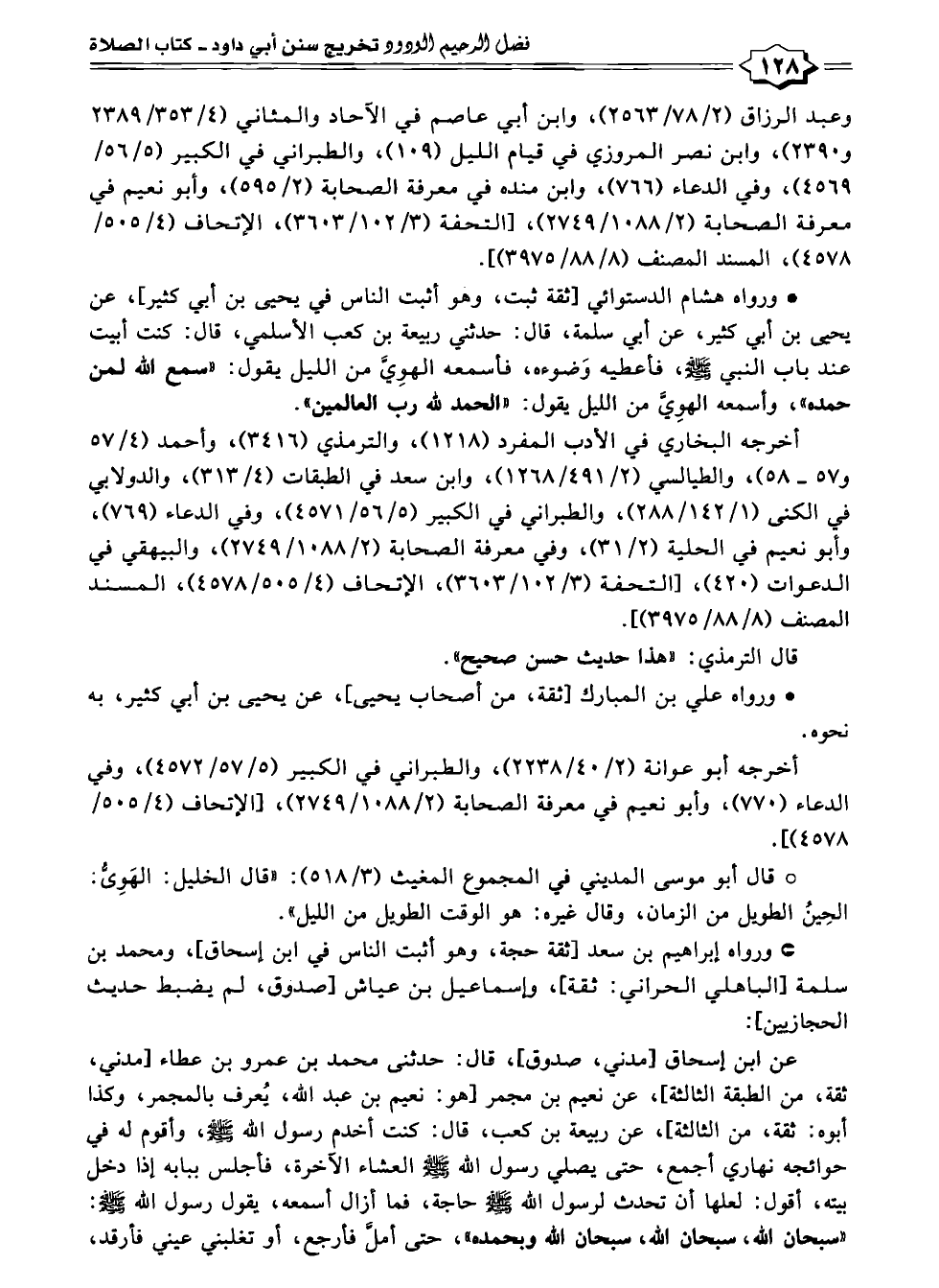 * ورواه هشام الدستوائي [ثقة ثبت، وهو أثبت الناس في يحيى بن أبي كثير]، عن يحعص بن أبي كثير، عن أبي سلمة، قال: حَدَّثَنِي ربيعة بن كعب الأسلمي، قال: كنت أبيت عند باب النَّبِيّ - صلى الله عليه وسلم -، فأعطيه وَضوءه، فاسمعه الهوِيَّ من الليل يقول: "سمع الله لمن حمده"، وأسمعه الهوِيَّ من الليل يقول: "الحمد لله رب العالمين".