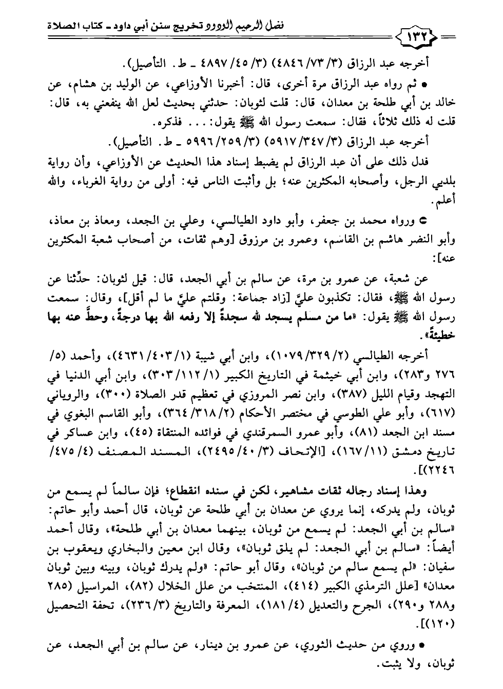 وهذا إسناد رجاله ثقات مشاهير، لكن في سنده انقطاع؛ فإن سالمًا لم يسمع من ثوبان، ولم يدركه، إنما يروي عن معدان بن أبي طلحة عن ثوبان، قال أحمد وأبو حاتم: "سالم بن أبي الجعد: لم يسمع من ثوبان، بينهما معدان بن أبي طلحة"، وقال أحمد أيضًا: "سالم بن أبي الجعد: لم يلق ثوبان"، وقال ابن معين والبخاري ويعقوب بن سفيان: "لم يسمع سالم من ثوبان"، وقال أبو حاتم: "ولم يدرك ثوبان، وبينه وبين ثوبان معدان" [علل الترمذي الكبير (٤١٤)، المنتخب من علل الخلال (٨٢)، المراسيل (٢٨٥ و ٢٨٨ و ٢٩٠)، الجرح والتعديل (٤/ ١٨١)، المعرفة والتاريخ (٣/ ٢٣٦)، تحفة التحصيل (١٢٠)].