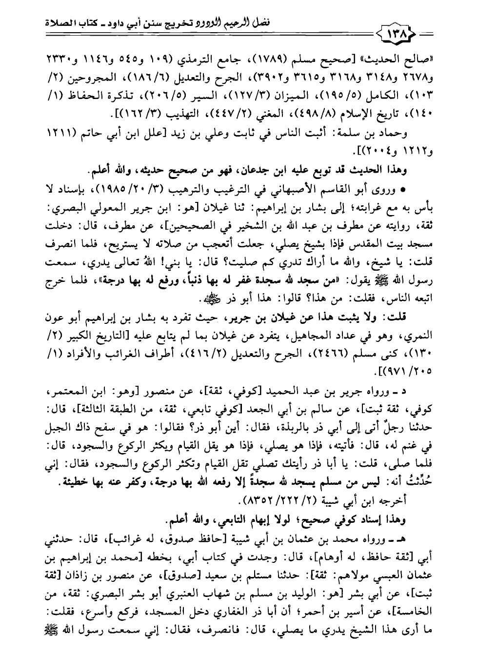د - ورواه جرير بن عبد الحميد [كوفي، ثقة]، عن منصور [وهو: ابن المعتمر، كوفي، ثقة ثبت]، عن سالم بن أبي الجعد [كوفي تابعي، ثقة، من الطبقة الثالثة]، قال: حَدَّثَنَا رجلٌ أتى إلى أبي ذر بالربذة، فقال: أين أبو ذر؟ فقالوا: هو في سفح ذاك الجبل في غنم له، قال: فأتيته، فإذا هو يصلي، فإذا هو يقل القيام ويكثر الركوع والسجود، قال: فلما صلى، قلت: يا أبا ذر رأيتك تصلي تقل القيام وتكثر الركوع والسجود، فقال: إني حُدِّثتُ أنه: ليس من مسلم يسجد للّه سجدةً إِلَّا رفعه اللّه بها درجة، وكفر عنه بها خطيئة.