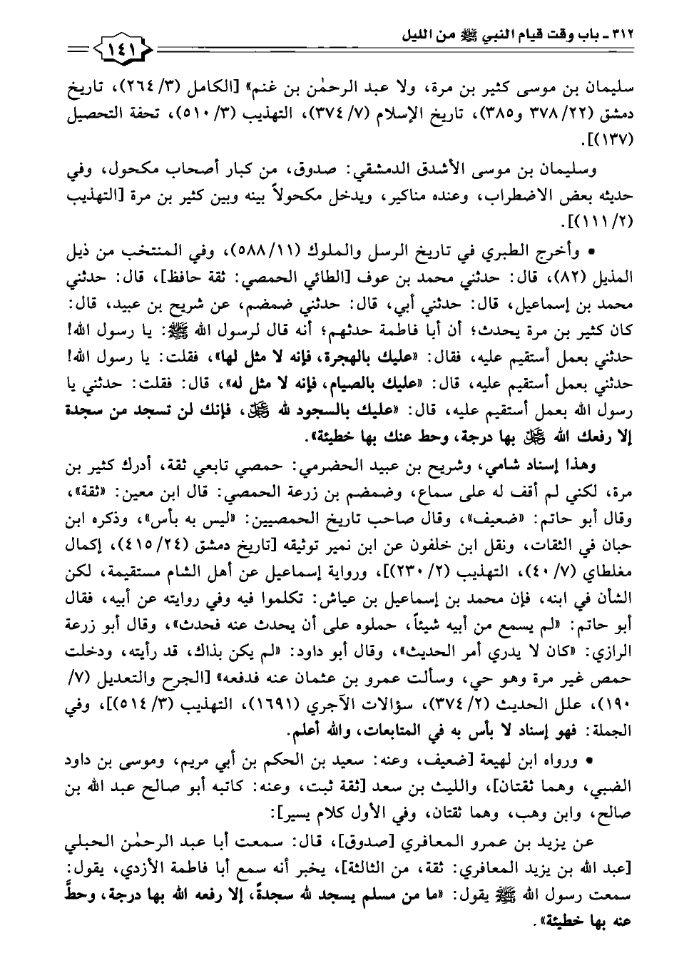 عن يزيد بن عمرو المعافري [صدوق]، قال: سمعت أبا عبد الرحمن الحبلي [عبد اللّه بن يزيد المعافري: ثقة، من الثالثة]، يخبر أنه سمع أبا فاطمة الأزدي، يقول: سمعت رسول الله - صلى الله عليه وسلم - يقول: "ما من مسلم يسجد لله سجدةً، إلا رفعه الله بها درجة، وحطَّ عنه بها خطيئة".