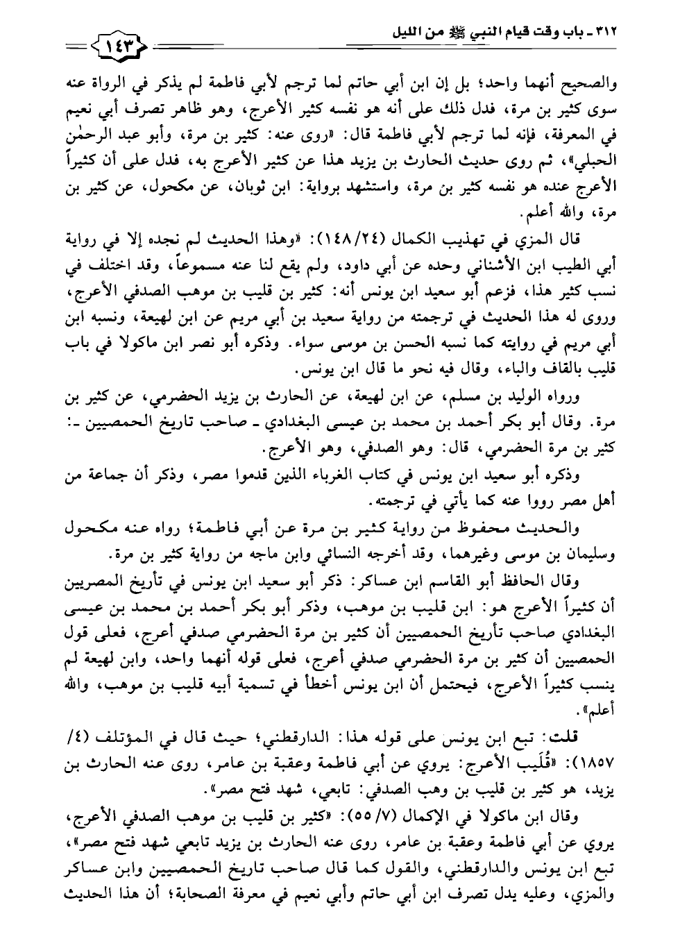 وقال ابن ماكولا في الإكمال (٧/ ٥٥): "كثير بن قليب بن موهب الصدفي الأعرج، يروي عن أبي فاطمة وعقبة بن عامر، روى عنه الحارث بن يزيد تابعي شهد فتح مصر"، تبع ابن يونس والدارقطني، والقول كما قال صاحب تاريخ الحمصيين وابن عساكر والمزي، وعليه يدل تصرف ابن أبي حاتم وأبي نعيم في معرفة الصحابة؛ أن هذا الحديث