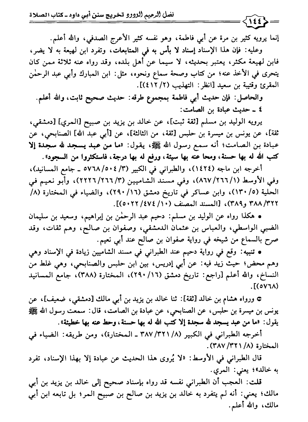 يرويه الوليد بن مسلم [ثقة ثبت]، عن خالد بن يزيد بن صبيح [المري] [دمشقي، ثقة]، عن يونس بن ميسرة بن حلبس [ثقة، من الثالثة]، عن [أبي عبد الله، الصنابحي، عن عبادة بن الصامت؛ أنه سمع رسول الله - صلى الله عليه وسلم -، يقول: "ما من عبد يسجد لله سجدة إِلَّا كتب الله له بها حسنة، ومحا عنه بها سيئة، ورفع له بها درجة، فاستكثروا من السجود".