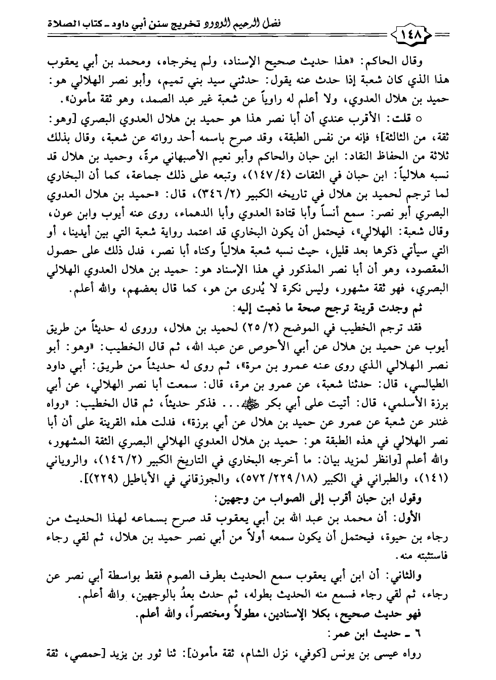 * قلت: الأقرب عندي أن أبا نصر هذا هو حميد بن هلال العدوي البصري أوهوت ثقة، من الثالثة]؛ فإنه من نفس الطبقة، وقد صرح باسمه أحد رواته عن شعبة، وقال بذلك ثلاثة من الحفاظ النقاد: ابن حبان والحاكم وأبو نعيم الأصبهاني مرة، وحميد بن هلال قد نسبه هلاليًا: ابن حبان في الثقات (٤/ ١٤٧)، وتبعه على ذلك جماعة، كما أن البخاري لما ترجم لحميد بن هلال في تاريخه الكبير (٢/ ٣٤٦)، قال: "حميد بن هلال العدوي البصري أبو نصر: سمع أنسًا وأبا قتادة العدوي وأبا الدهماء، روى عنه أيوب وابن عون، وقال شعبة: الهلالي"، فيحتمل أن يكون البخاري قد اعتمد رواية شعبة التي بين أيدينا، أو التي سيأتي ذكرها بعد قليل، حيث نسبه شعبة هلاليًا وكناه أبا نصر، فدل ذلك على حصول المقصود، وهو أن أبا نصر المذكور في هذا الإسناد هو: حميد بن هلال العدوي الهلالي البصري، فهو ثقة مشهور، وليس نكرة لا يُدرى من هو، كما قال بعضهم، والله أعلم.