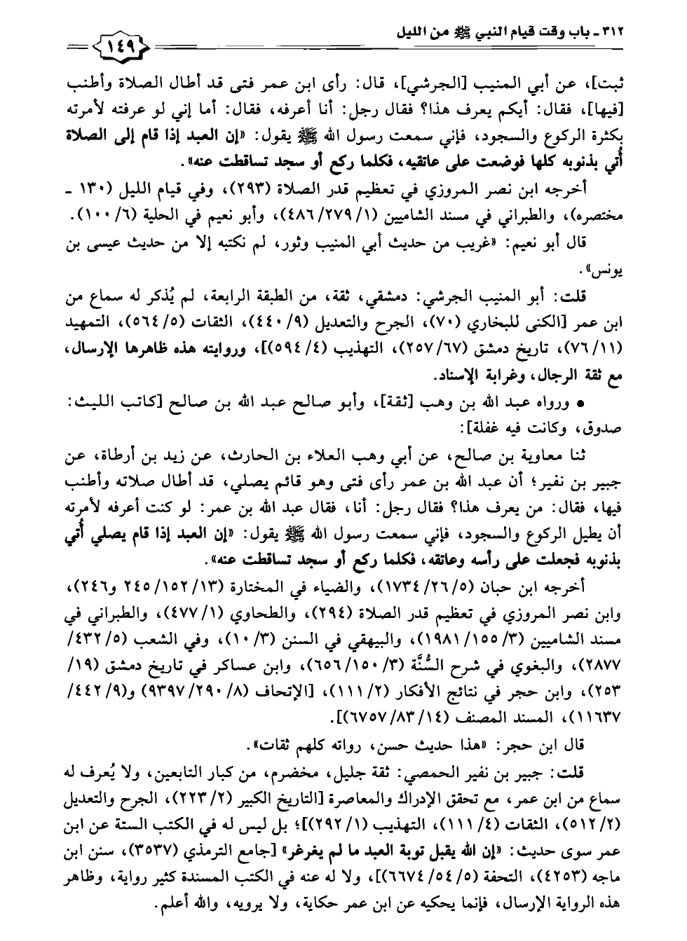 قلت: أبو المنيب الجرشي: دمشقي، ثقة، من الطبقة الرابعة، لم يُذكر له سماع من ابن عمر [الكنى للبخاري (٧٠)، الجرح والتعديل (٩/ ٤٤٠)، الثقات (٥/ ٥٦٤)، التمهيد (١١/ ٧٦)، تاريخ دمشق (٦٧/ ٢٥٧)، التهذيب (٤/ ٥٩٤)]، وروايته هذه ظاهرها الإرسال، مع ثقة الرجال، وغرابة الإسناد.