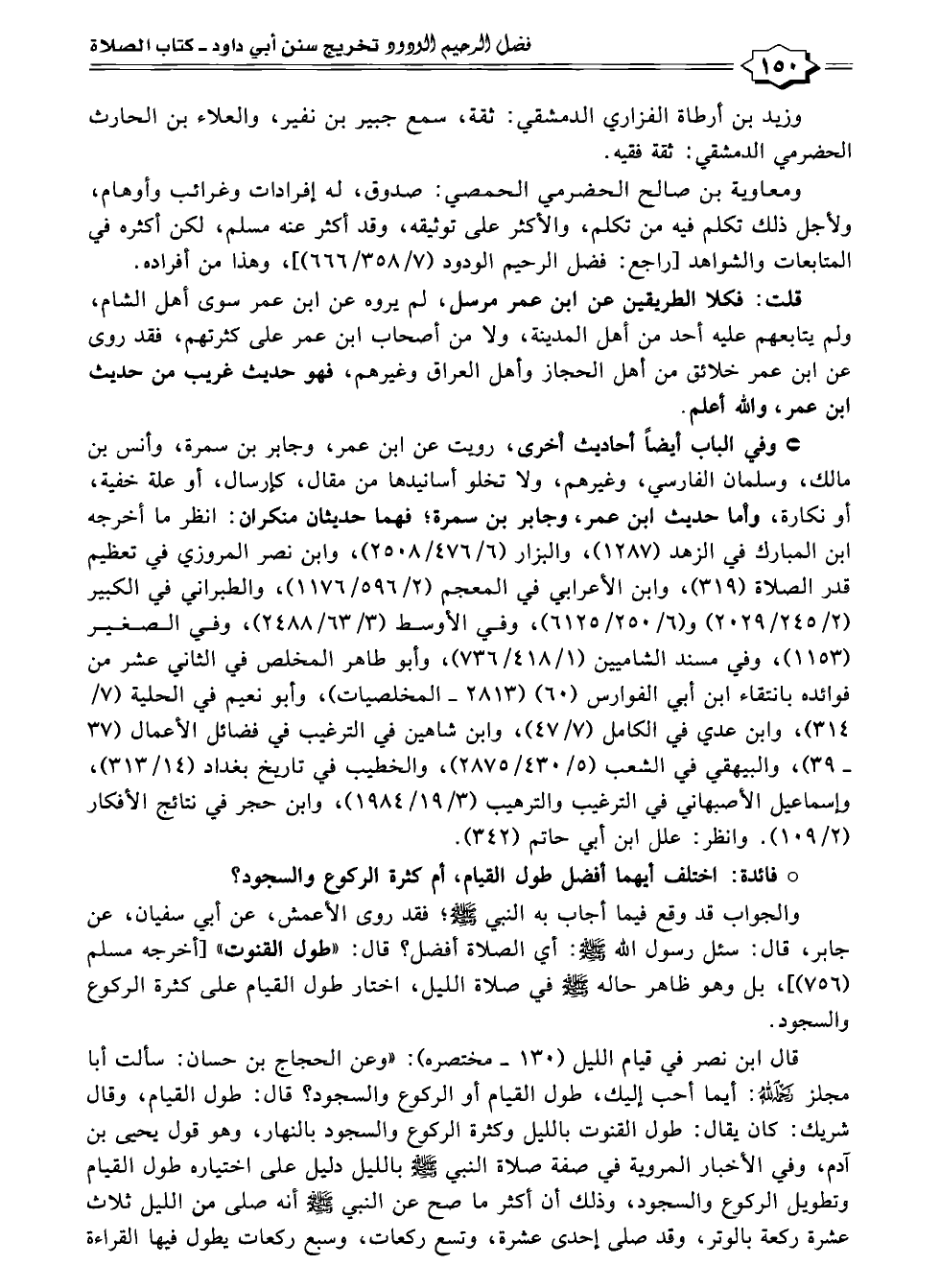 قال ابن نصر في قيام الليل (١٣٠ - مختصره): "وعن الحجاج بن حسان: سألت أبا مجلز - رَحِمَهُ اللّه -: أيما أحب إليك، طول القيام أو الركوع والسجود؟ قال: طول القيام، وقال شريك: كان يقال: طول القنوت بالليل وكثرة الركوع والسجود بالنهار، وهو قول يحيى بن آدم، وفي الأخبار المروية في صفة صلاة النَّبِيّ - صلى الله عليه وسلم - بالليل دليل على اختياره طول القيام وتطويل الركوع والسجود، وذلك أن أكثر ما صح عن النَّبِيّ - صلى الله عليه وسلم - أنه صلى من الليل ثلاث عشرة ركعة بالوتر، وقد صلى إحدى عشرة، وتسع ركعات، وسبع ركعات يطول فيها القراءة