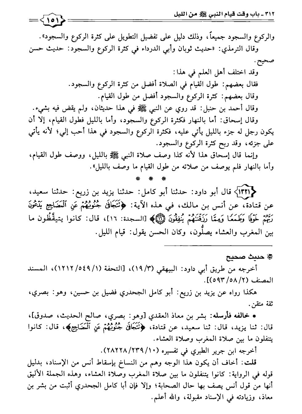 ١٣٢١ قال أبو داود: حدثنا أبو كامل: حدثنا يزيد بن زريع: حدثنا سعيد، عن قتادة، عن أنس بن مالك، في هذه الآية: {تَتَجَافَى جُنُوبُهُمْ عَنِ الْمَضَاجِعِ يَدْعُونَ رَبَّهُمْ خَوْفًا وَطَمَعًا وَمِمَّا رَزَقْنَاهُمْ يُنْفِقُونَ (١٦)} [السجدة: ١٦]، قال: كانوا يتيقَّظُون ما بين المغرب والعشاء يصلُّون، وكان الحسن يقول: قيام الليل.