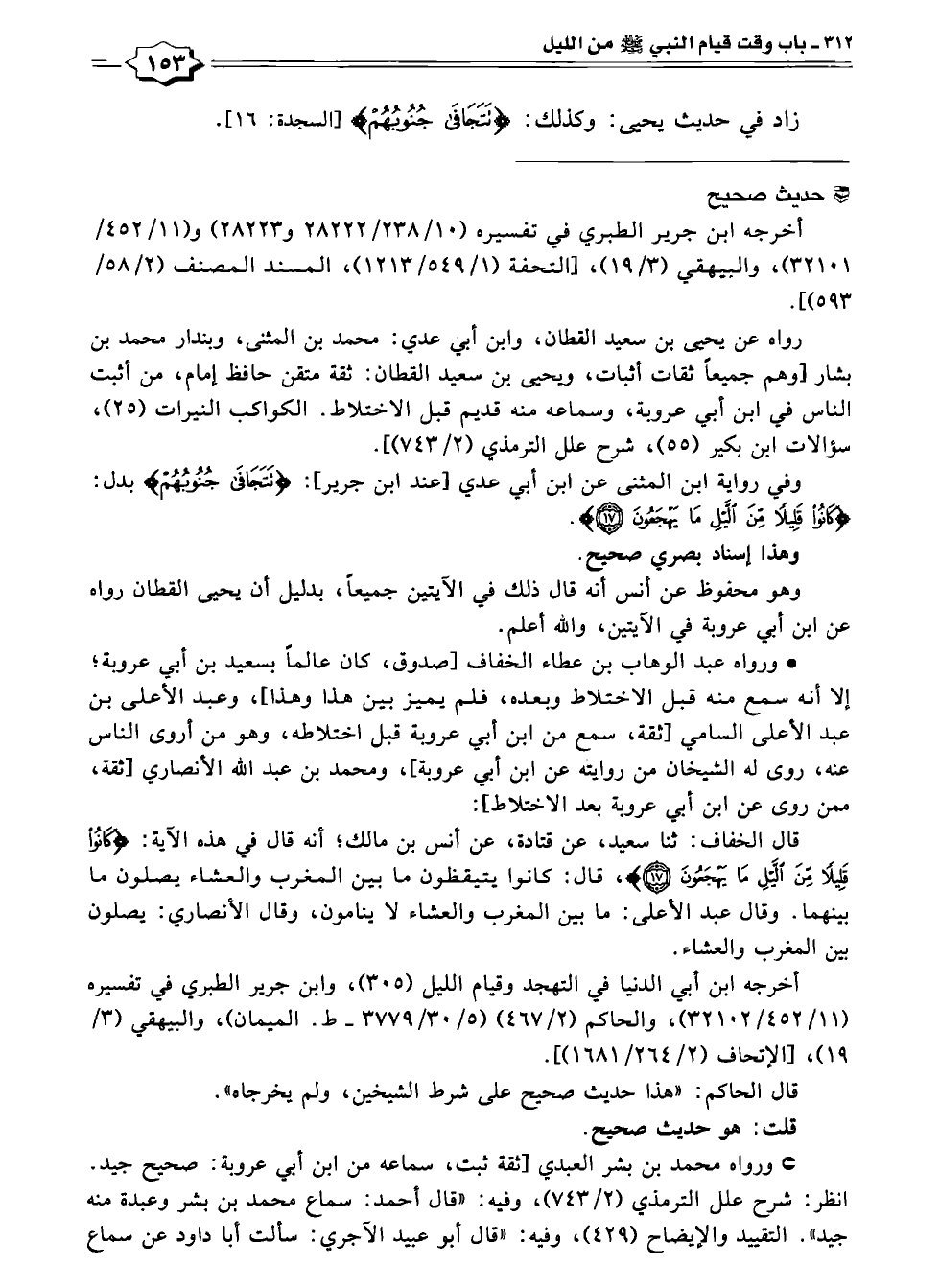 وفي رواية ابن المثنى عن ابن أبي عدي [عند ابن جرير]: {تَتَجَافَى جُنُوبُهُمْ} بدل: {كَانُوا قَلِيلًا مِنَ اللَّيْلِ مَا يَهْجَعُونَ (١٧)}.