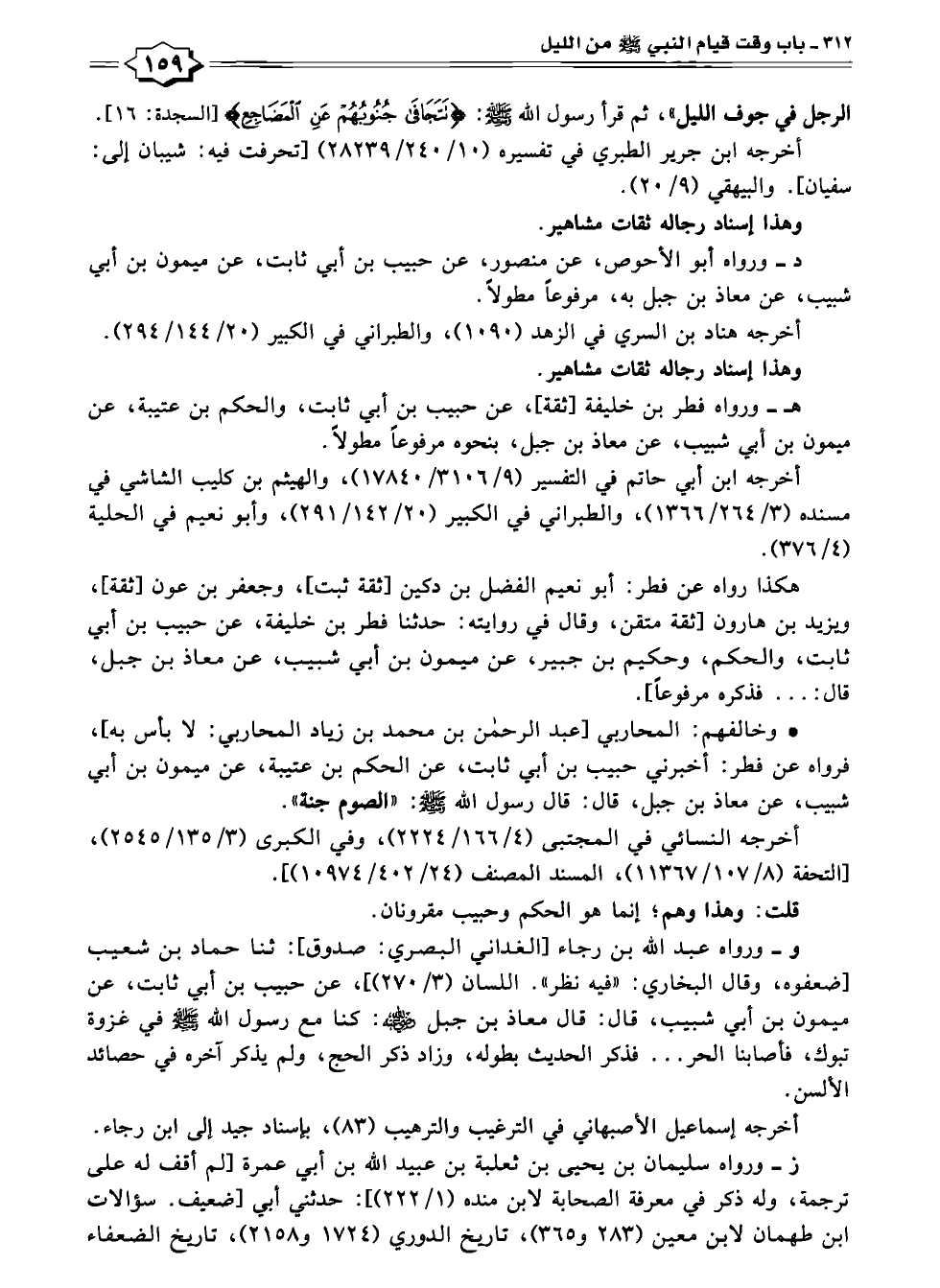 هـ - ورواه فطر بن خليفة [ثقة]، عن حبيب بن أبي ثابت، والحكم بن عتيبة، عن ميمون بن أبي شبيب، عن معاذ بن جبل، بثحوه مرفوعًا مطولًا.