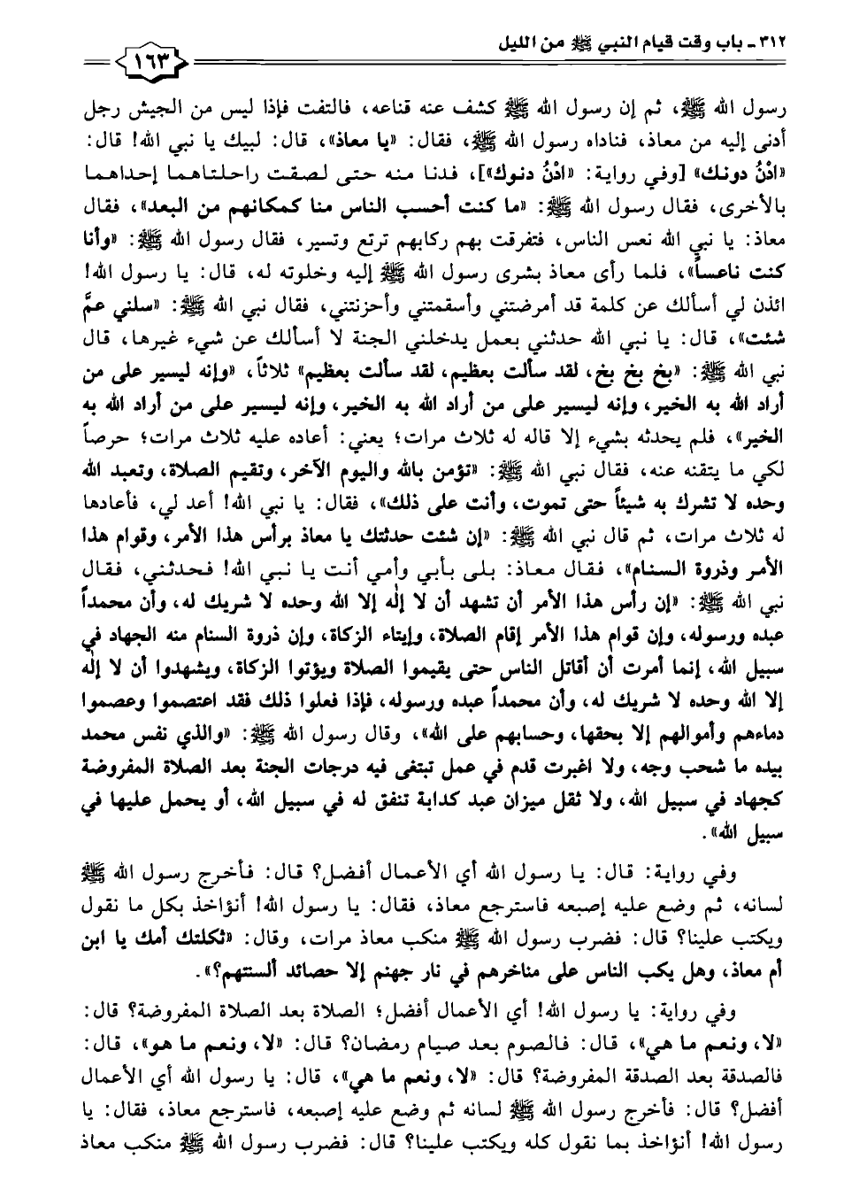 رسول الله - صلى الله عليه وسلم -، ثم إن رسول الله - صلى الله عليه وسلم - كشف عنه قناعه، فالتفت فإذا ليس من الجيش رجل أدنى إليه من معاذ، فناداه رسول الله - صلى الله عليه وسلم -، فقال: "يا معاذ"، قال: لبيك يا نبي الله! قال: "ادْنُ دونك" [وفي رواية: "ادْنُ دنوك"]، فدنا منه حتى لصقت راحلتاهما إحداهما بالأخرى، فقال رسول الله - صلى الله عليه وسلم -: "ما كنت أحسب الناس منا كمكانهم من البعد"، فقال معاذ: يا نبي الله نعس الناس، فتفرقت بهم ركابهم ترتع وتسير، فقال رسول الله - صلى الله عليه وسلم -: "وأنا كنت ناعسًا"، فلما رأى معاذ بشرى رسول الله - صلى الله عليه وسلم - إليه وخلوته له، قال: يا رسول الله! ائذن لي أسألك عن كلمة قد أمرضتني وأسقمتني وأحزنتني، فقال نبي الله - صلى الله عليه وسلم -: "سلني عمَّ شئت"، قال: يا نبي الله حدثني بعمل يدخلني الجنة لا أسألك عن شيء غيرها، قال نبي الله - صلى الله عليه وسلم -: "بخ بخ بخ، لقد سألت بعظيم" لقد سألت بعظيم" ثلاثًا، "وإنه ليسير على من أراد الله به الخير، وإنه ليسير على من أراد الله به الخير، وإنه ليسير على من أراد الله به الخير"، فلم يحدثه بشيء إلا قاله له ثلاث مرات؛ يعني: أعاده عليه ثلاث مرات؛ حرصًا لكي ما يتقنه عنه، فقال نبي الله - صلى الله عليه وسلم -: "تؤمن بالله واليوم الآخر، وتقيم الصلاة، وتعبد الله وحده لا تشرك به شيئًا حتى تموت، وأنت على ذلك"، فقال: يا نبي الله! أعد لي، فأعادها له ثلاث مرات، ثم قال نبي الله - صلى الله عليه وسلم -: "إن شئت حدثتك يا معاذ برأس هذا الأمر، وقوام هذا الأمر وذروة السنام"، فقال معاذ: بلى بأبي وأمي أنت يا نبي الله! فحدثني، فقال نبي الله - صلى الله عليه وسلم -: "إن رأس هذا الأمر أن تشهد أن لا إله إلا الله وحده لا شريك له، وأن محمدًا عبده ورسوله، وإن قوام هذا الأمر إقام الصلاة، وإيتاء الزكاة، وإن ذروة السنام منه الجهاد في سبيل الله، إنما أمرت أن أقاتل الناس حتى يقيموا الصلاة ويؤتوا الزكاة، ويشهدوا أن لا إله إلا الله وحده لا شريك له، وأن محمدًا عبده ورسوله، فإذا فعلوا ذلك فقد اعتصموا وعصموا دماءهم وأموالهم إلا بحقها، وحسابهم على الله"، وقال رسول الله - صلى الله عليه وسلم -: "والذي نفس محمد بيده ما شحب وجه، ولا اغبرت قدم في عمل تبتغى فيه درجات الجنة بعد الصلاة المفروضة كجهاد في سبيل الله، ولا ثقل ميزان عبد كدابة تنفق له في سبيل الله، أو يحمل عليها في سبيل الله".